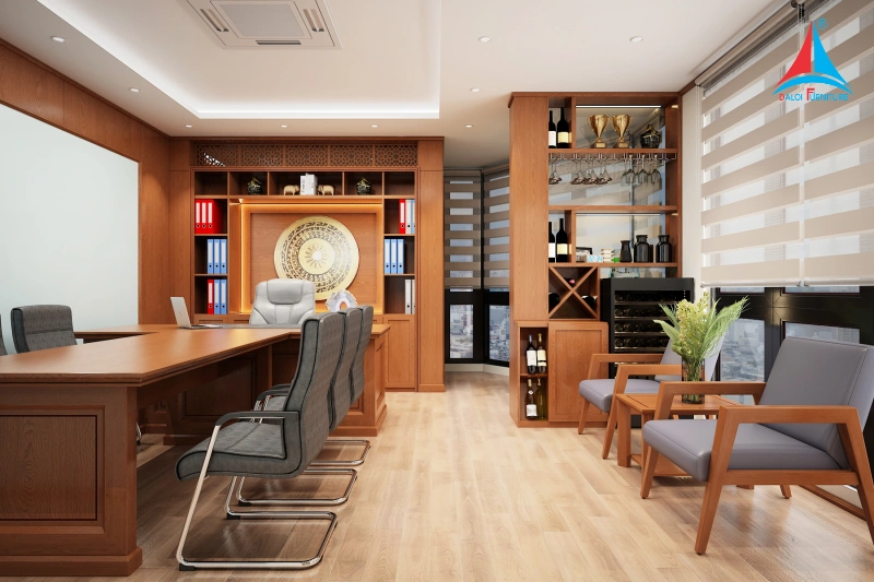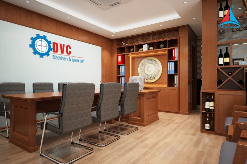 Không gian dành cho lãnh đạo có thiết kế theo phong cách truyền thống nhưng vẫn rất sang trọng, tinh tế. Trong văn phòng dành cho giám đốc, Nội Thất Đa Lợi đã bố trí hệ thống tủ tài liệu kiêm kệ trưng bày trang trí được kê sát tường để tiết kiệm tối đa diện tích sử dụng. Thiết kế của tủ có phong cách đồng nhất với tổng thể không gian tạo nên sự chuyên nghiệp cho khu vực làm việc.