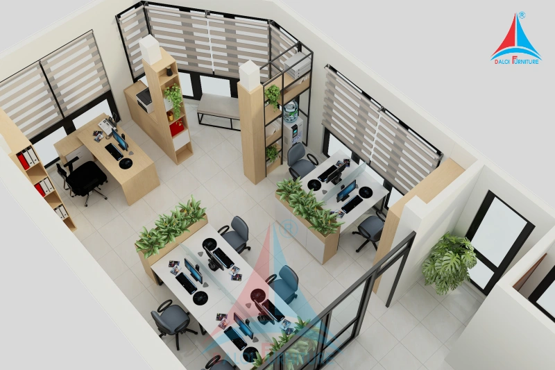 Không gian làm việc chung được phân chia với khu vực làm việc của trưởng phòng bằng vách ngăn lửng và kệ trang trí. Kiểu vách ngăn lửng này có nhiều tiện ích đa dạng vừa tiết kiệm tối đa diện tích sử dụng và tăng thêm thẩm mỹ cho không gian văn phòng.