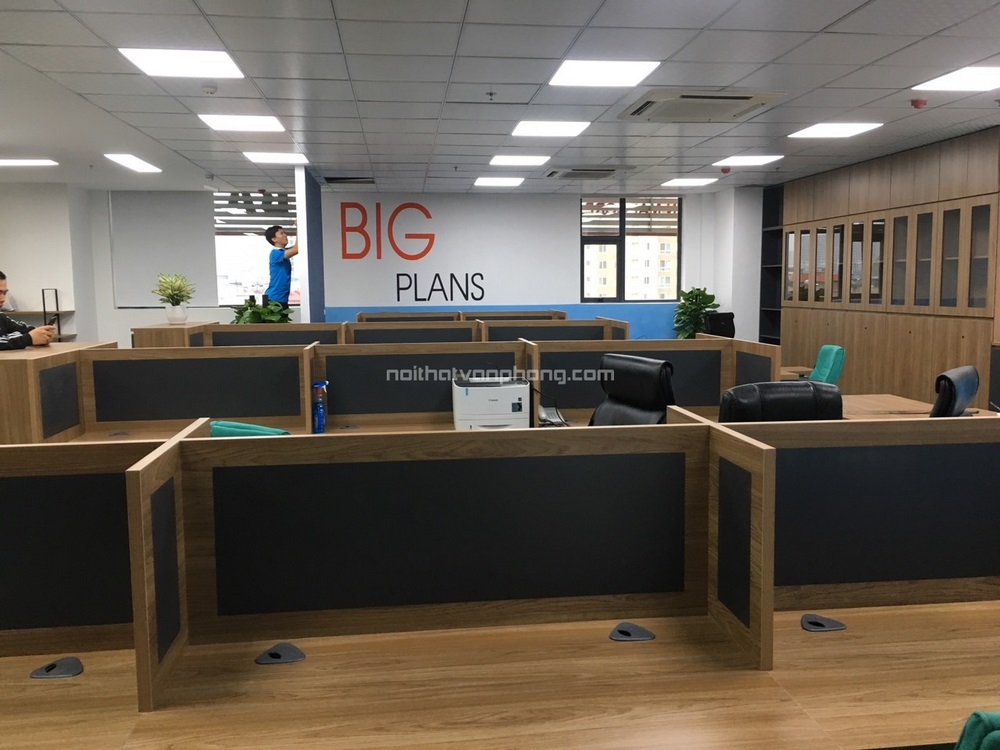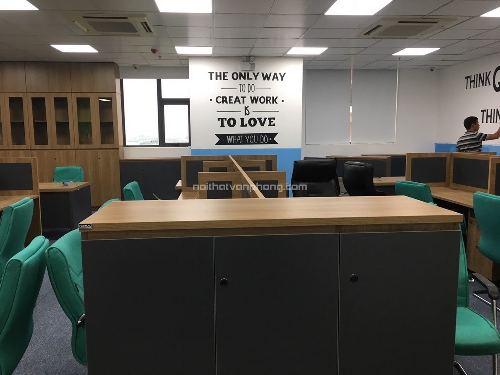 Không gian làm việc của đội ngũ nhân viên sử các sản phẩm nội thất chủ yếu từ chất liệu gỗ công nghiệp cao cấp. Vách ngăn được gắn trực tiếp vào mặt bàn tạo nên không gian làm việc riêng tư nhưng vẫn có thể dễ dàng giao tiếp, trao đổi với các đồng nghiệp khác.