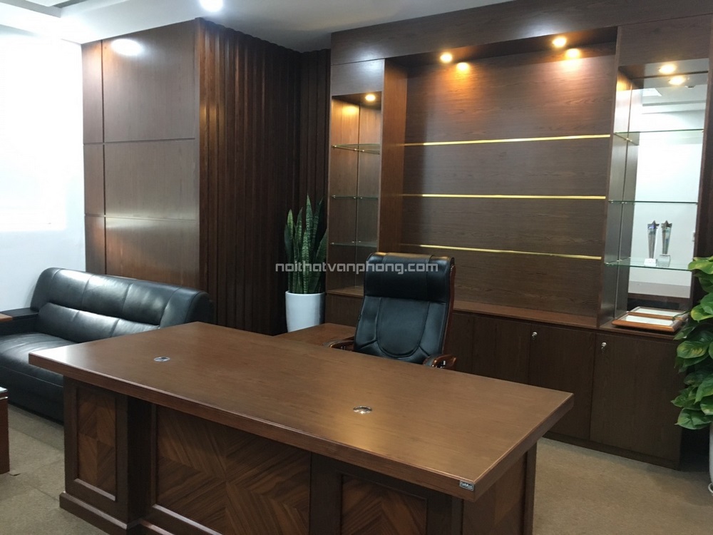 Diện tích phòng giám đốc quá lớn nên Nội Thất Đa Lợi đã ưu tiên các mẫu nội thất có kích thước nhỏ gọn. Bàn gỗ công nghiệp cao cấp dạng chữ L kết hợp với ghế da thật tạo nên sự chuyên nghiệp, quyền lực cần có của căn phòng. Bộ sofa cùng tông màu là nơi đón tiếp khách hàng, đối tác đến làm việc từ đệm mút êm ái bọc da thật.