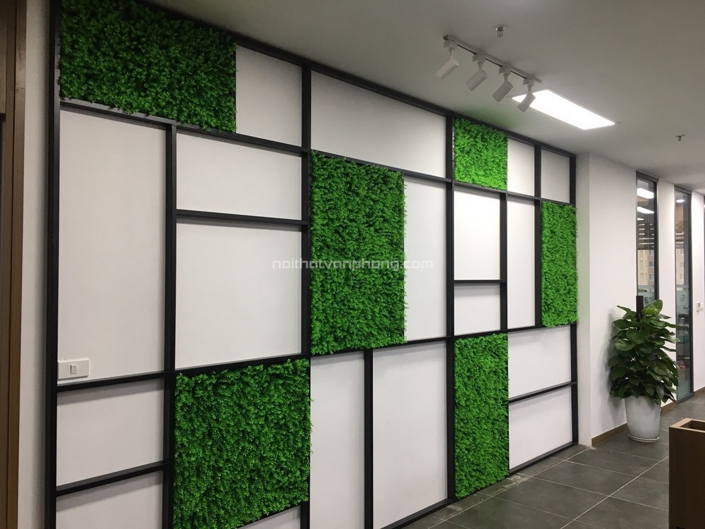 Vách ngăn từ khung sắt kết hợp với các mảng cỏ xanh nhân tạo rất độc đáo. Thiết kế văn phòng làm việc chung của bất động sản Xuân Mai hướng đến không gian xanh, thân thiện với mọi người.