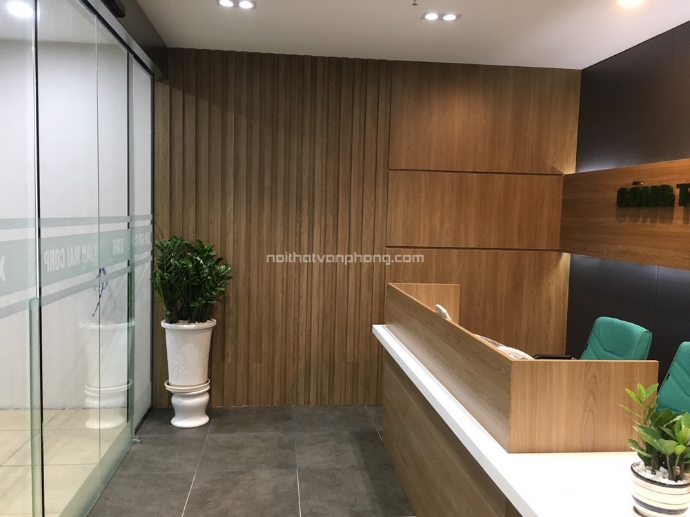 Cùng theo tông màu trầm kết hợp giữa màu xanh, trắng và đen như thiết kế ở văn phòng làm việc. Không gian lễ tân cũng sử dụng bàn gỗ công nghiệp và ghế da chân quỳ đồng bộ. Vách tường ốp gỗ tự nhiên cao cấp được in nổi logo và tên thương hiệu tăng thêm ấn tượng cho khách hàng, đối tác khi đến làm việc tại văn phòng.