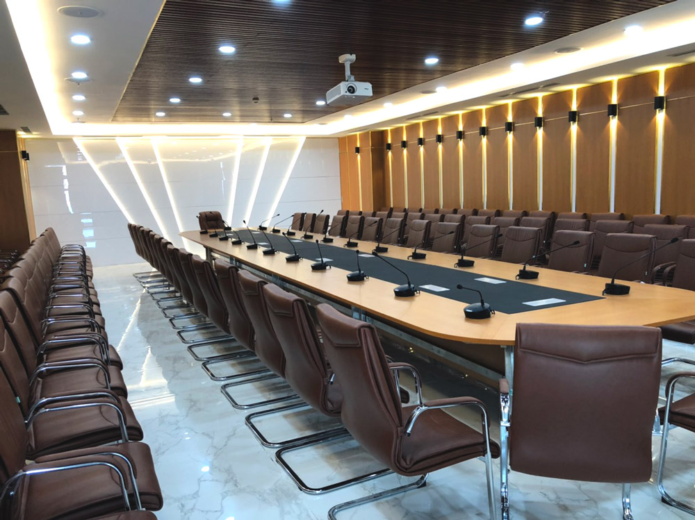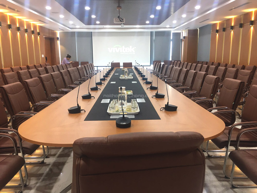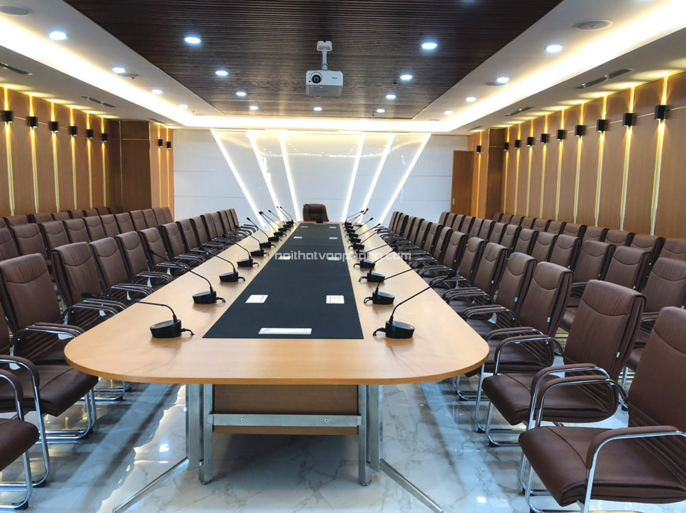Không gian phòng bố trí một bàn phòng họp lớn ngay trung tâm. Mẫu bàn này có kiểu dáng chữ nhật nhưng được bo tròn ở các góc nên tạo sự mềm mại và cách điệu cho sản phẩm. Trên mặt bàn được gắn cố định mic và cũng có khe hở để luồn dây điện trong quá trình sử dụng. Phía dưới bàn chân sắt sơn tĩnh điện nên vô cùng chắc chắn và bền bỉ trong thời gian sử dụng.