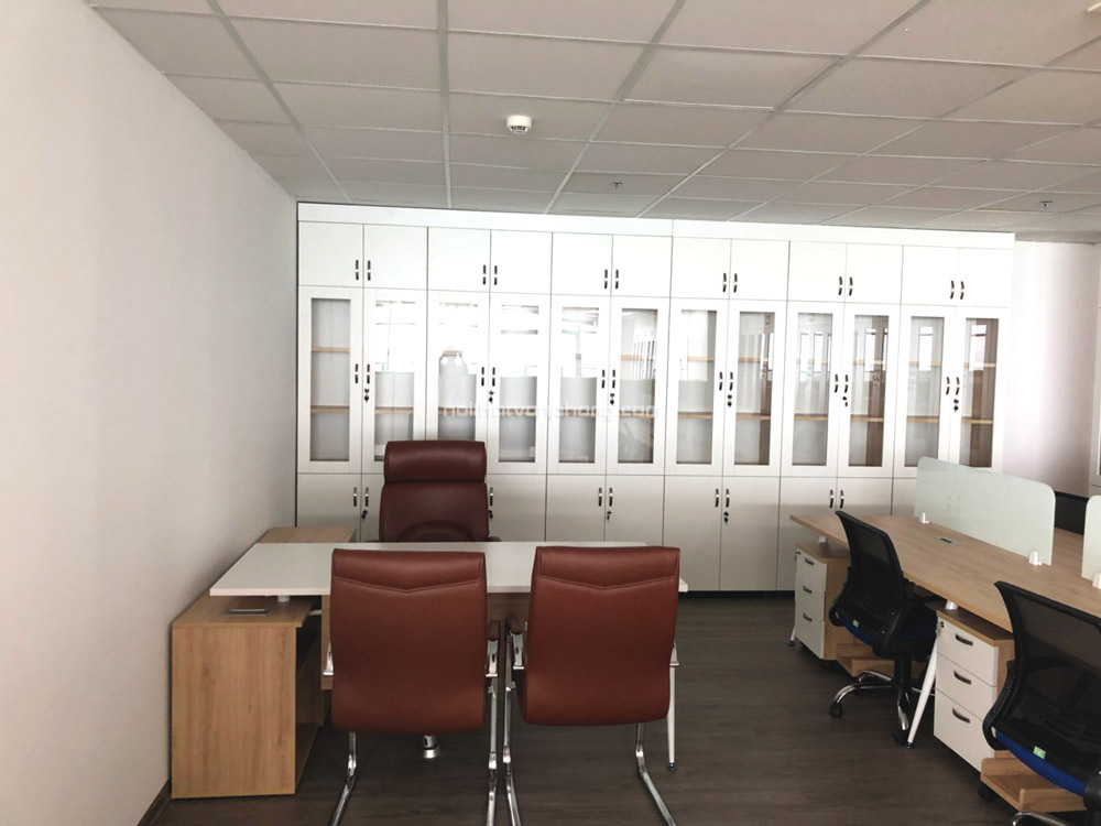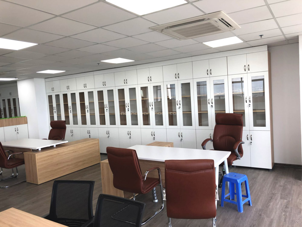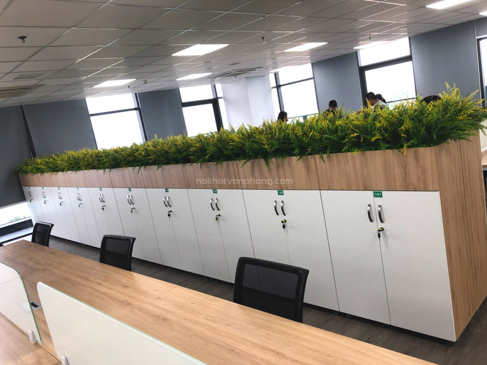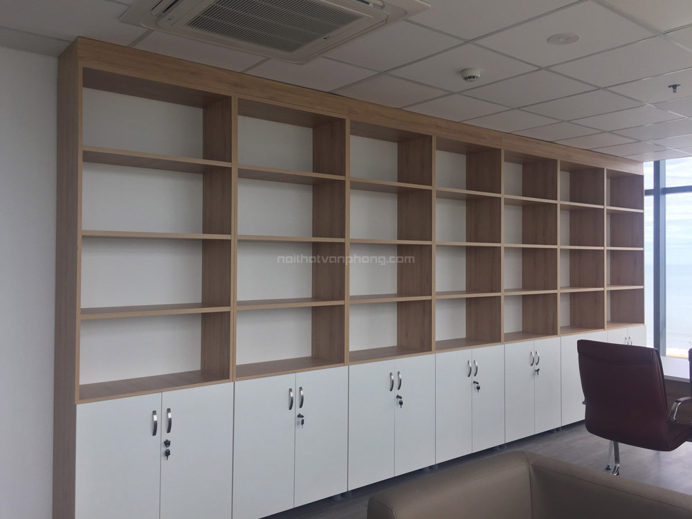 Ngoài ra, không gian phòng cũng có thêm tủ tài liệu. Mẫu tủ này được làm bằng chất liệu sắt chia 2 phần: Phần trên có các đợt gỗ chia ngăn và cánh cửa kính còn phần dưới thì là các cánh gỗ với khóa bảo mật chắc chắn.