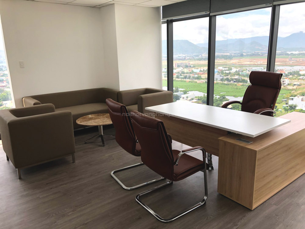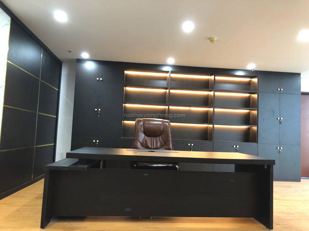 Không gian phòng lãnh đạo được đặt mẫu bàn giám đốc dạng chữ L có tông màu trầm truyền thống rất sang trọng. Phối hợp với bàn là ghế da chân xoay có sắc nâu tinh tế tạo nên sự quyền lực cho không gian của người đứng đầu doanh nghiệp.