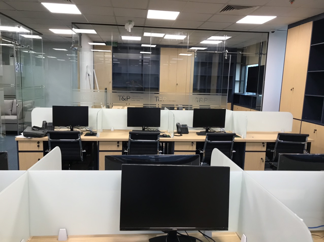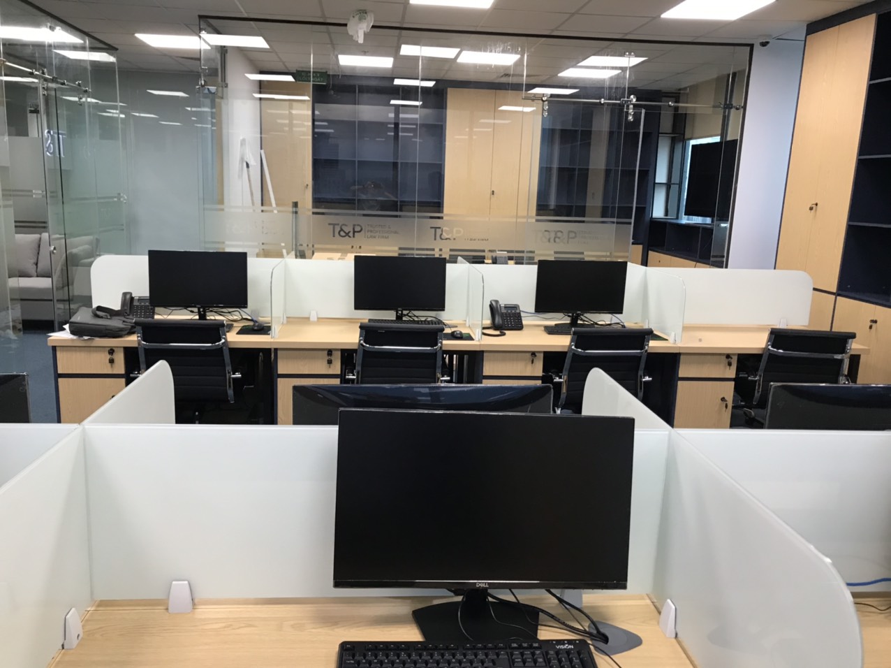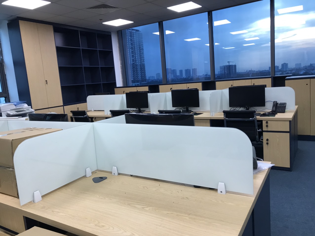 Không gian văn phòng làm việc chung được bao quanh bởi chất liệu kính cường lực nên tạo một nơi làm việc thông thoáng, thoải mái. Bàn làm việc từ chất liệu gỗ công nghiệp cao cấp nên có tính thẩm mỹ cao, bề mặt nhẵn mịn, dễ vệ sinh cùng khả năng chống nước, chống ẩm, chống nhiệt hiệu quả. Màu sắc bàn bắt mắt và sang trọng kết hợp cùng màu trắng của tấm che tạo nên không gian nhất quán và tinh tế đúng tiêu chuẩn cần có của một văn phòng làm việc.