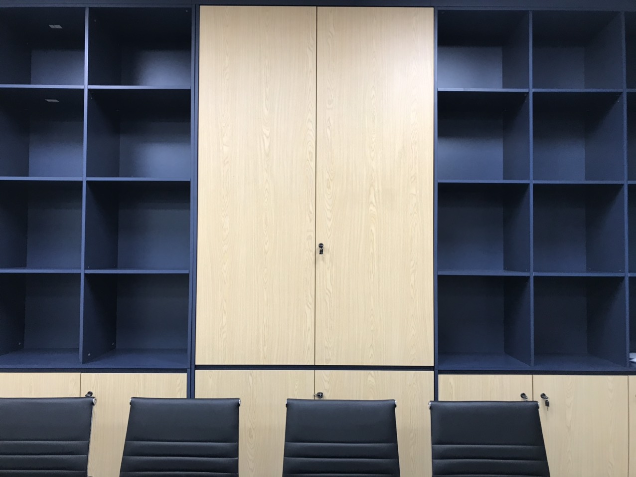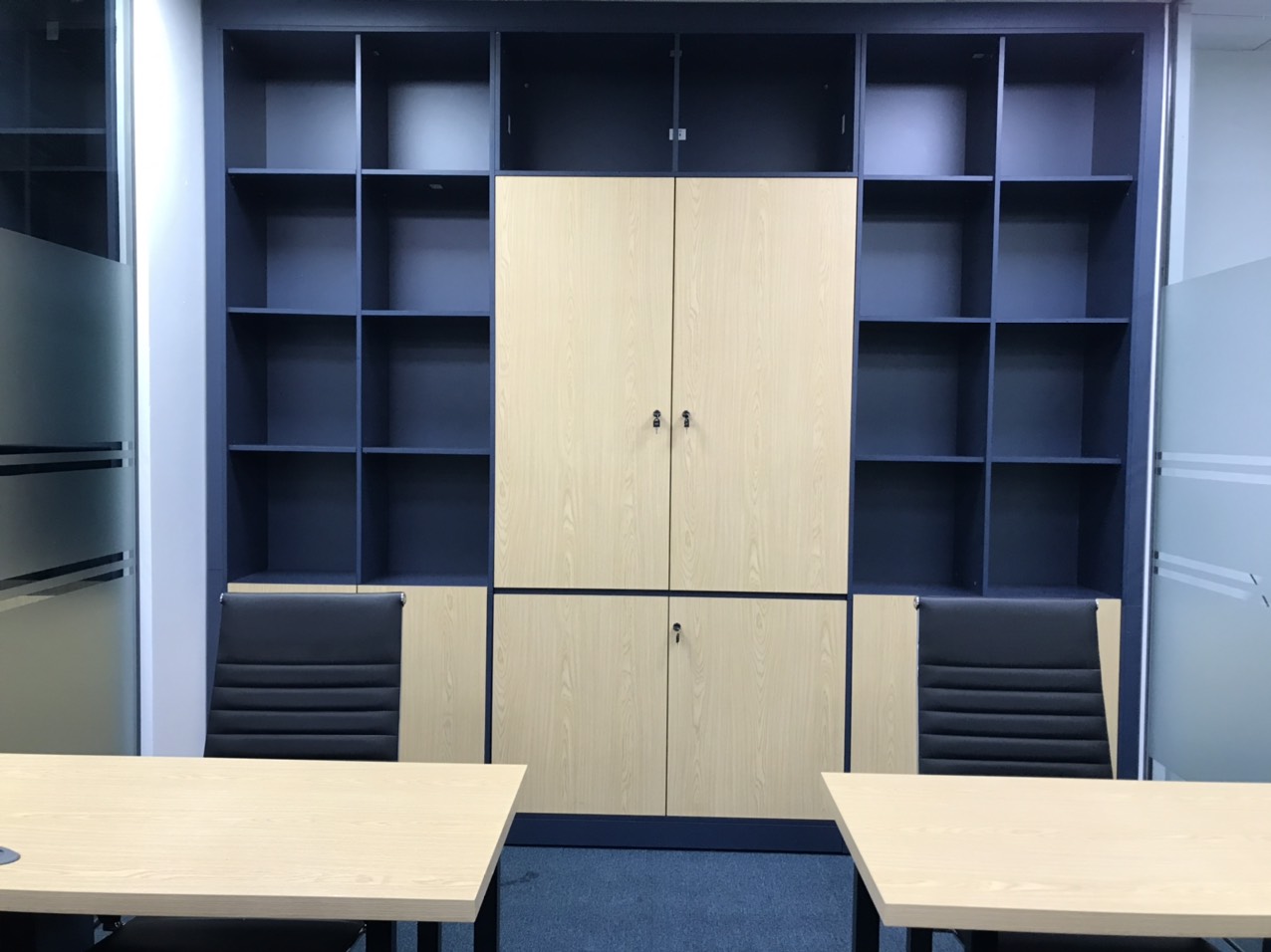 Phía sát tường của phòng nhân viên còn có tủ tài liệu cỡ lớn. Mẫu tủ này có thiết kế dạng tủ cánh dài đứng kết hợp cùng với kiểu tủ có phần trên chia thành từng ô nhỏ bằng các đợt gỗ. Phía dưới tủ có cánh mở với khóa an toàn. Kiểu thiết kế này cho các nhân viên thoải mái trang trí cũng như dự trữ hồ sơ, giấy tờ, sổ sách một cách ngăn nắp mà vẫn dễ tìm kiếm,, thuận tiện sử dụng.