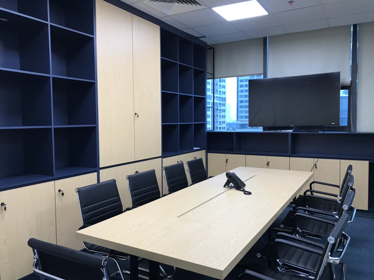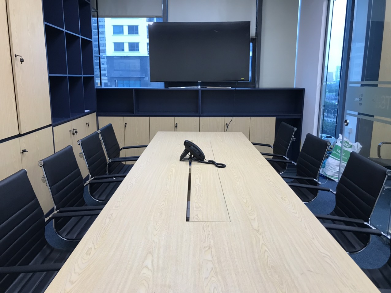 Phòng họp được bố trí mẫu bàn chữ nhật dài ở trung tâm bao quanh là một dãy ghế phòng họp cao cấp. Ngoài ra, bên cạnh còn có tủ tài liệu được bố trí sát tường giúp tiết kiệm và tối ưu không gian sử dụng. Mẫu tủ này có kiểu dáng đáp ứng yêu cầu của cơ quan tạo nên sự sang trọng, hiện đại cho không gian.