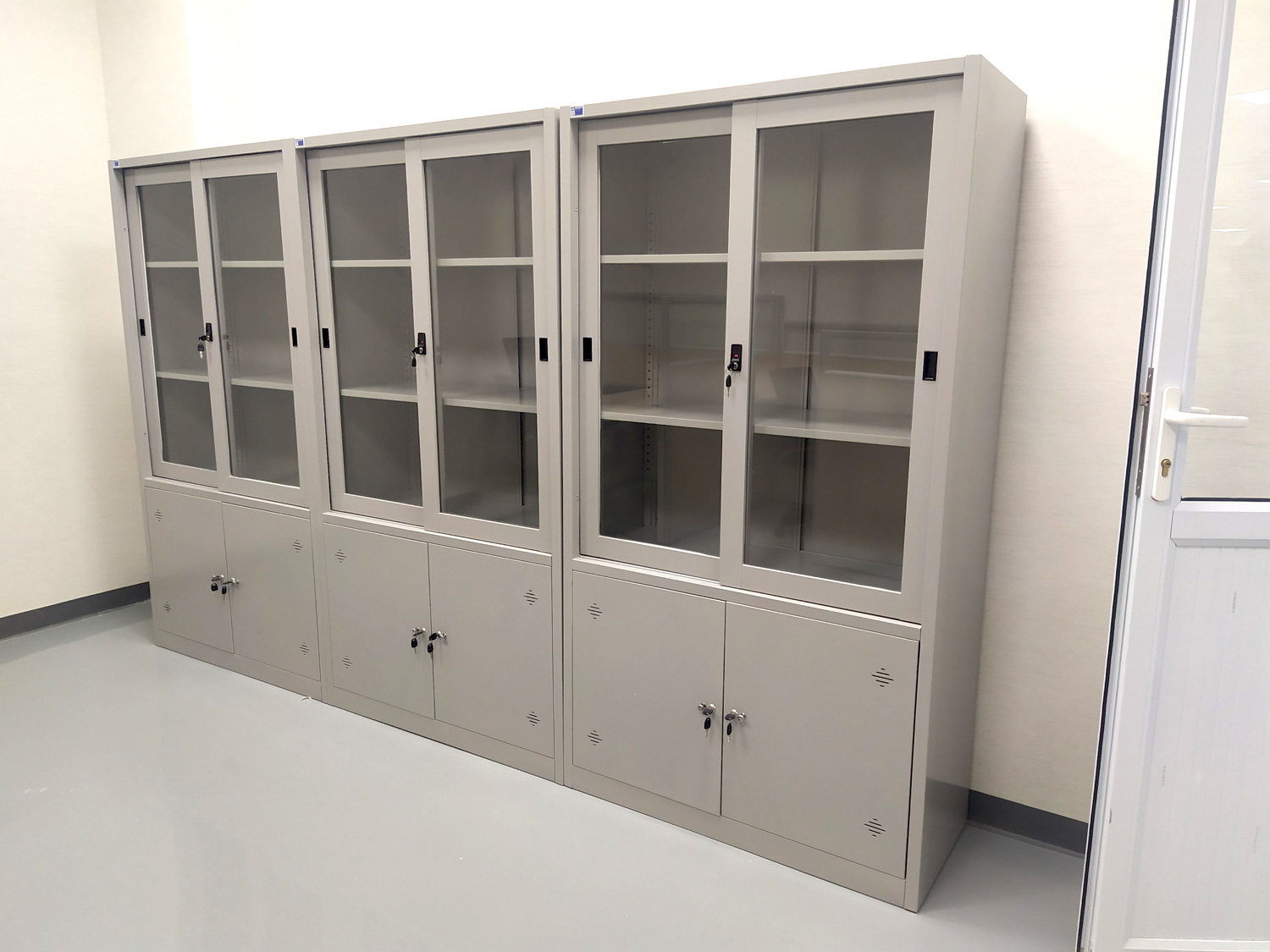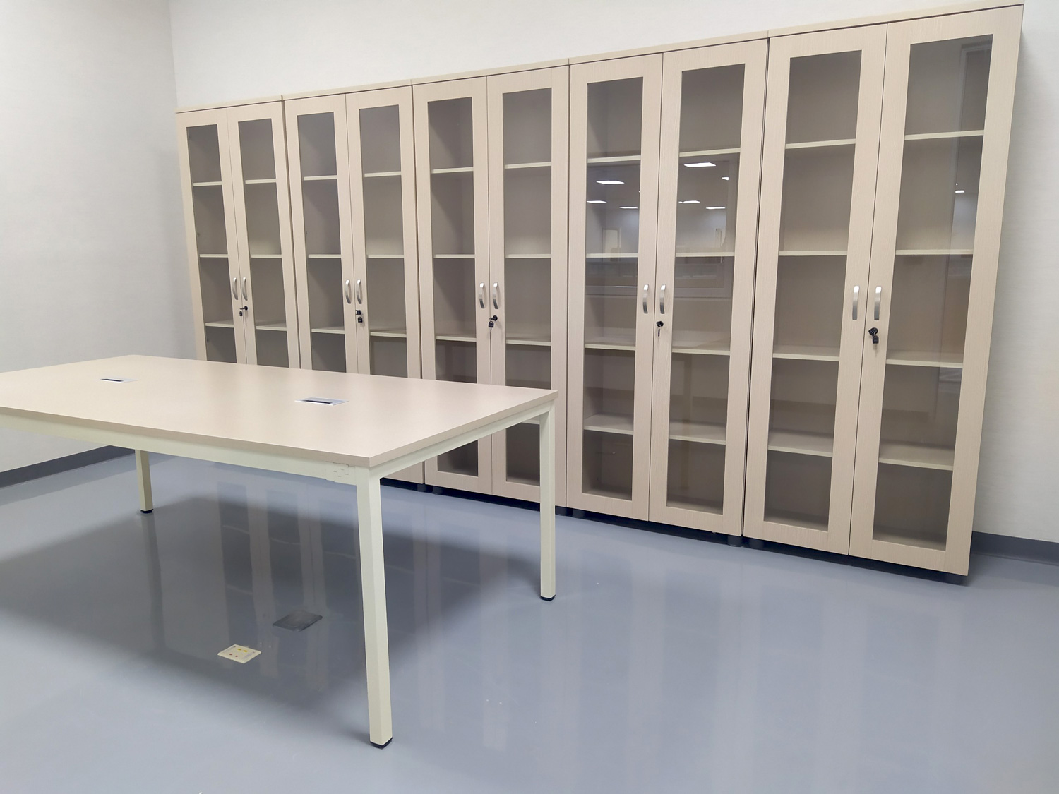 Văn phòng còn được sắp xếp thêm tủ tài liệu tạo nên không gian phụ lưu trữ hồ sơ, tài liệu. Tủ có nhiều ngăn đựng đồ dùng, giấy tờ gọn gàng, ngăn nắp. Kèm theo đó là một chiếc bàn cùng tông màu giúp việc tìm kiếm, kiểm tra tài liệu đơn giản, dễ dàng hơn.