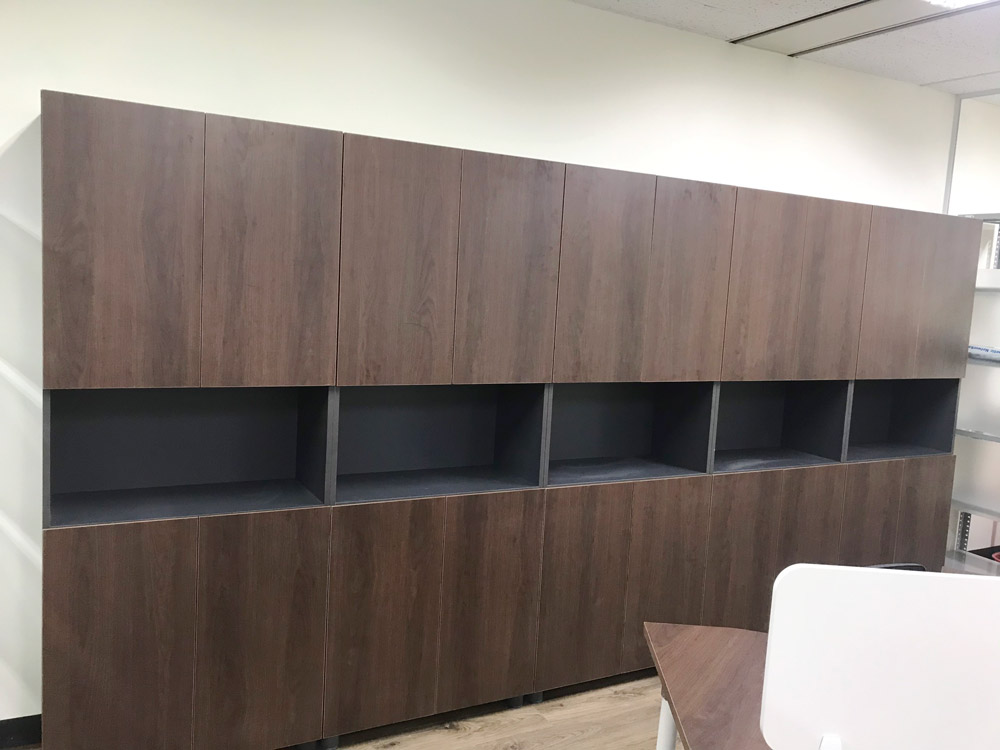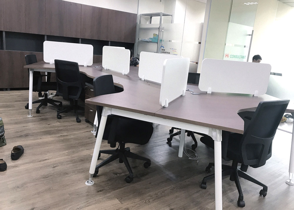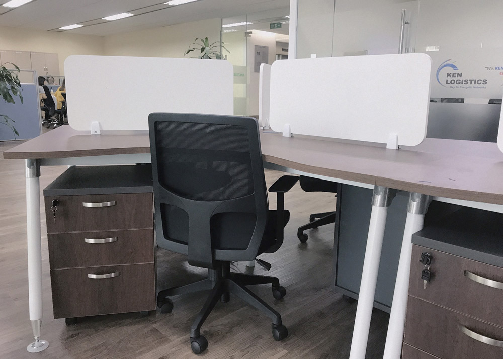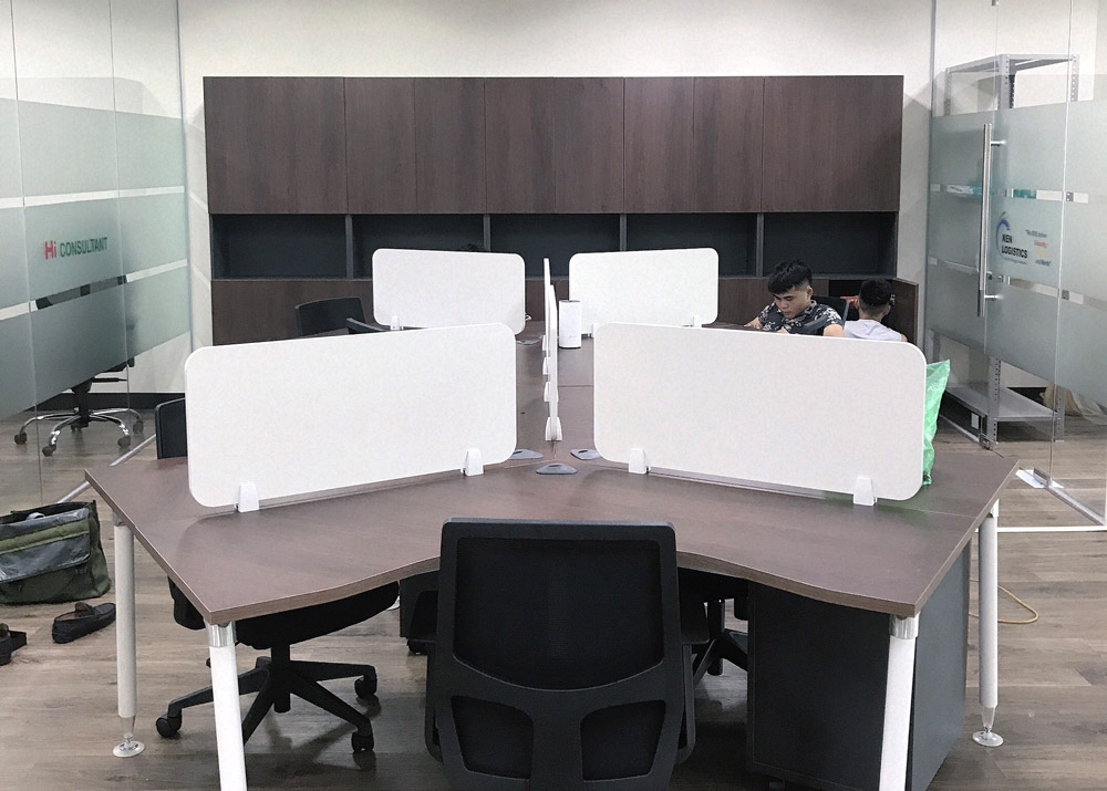 Bên cạnh bàn dạng chữ X độc đáo là kiểu phối màu rất thời thượng, màu trắng và màu vân gỗ nâu khi phối với nhau rất hài hoà và đẹp mắt. Có thể nói, nội thất văn phòng công ty TNHH Ken Logistics rất ấn tượng và đặc biệt, mang lại một không gian hoàn toàn mới mẻ so với phòng làm việc chung của nhiều doanh nghiệp.