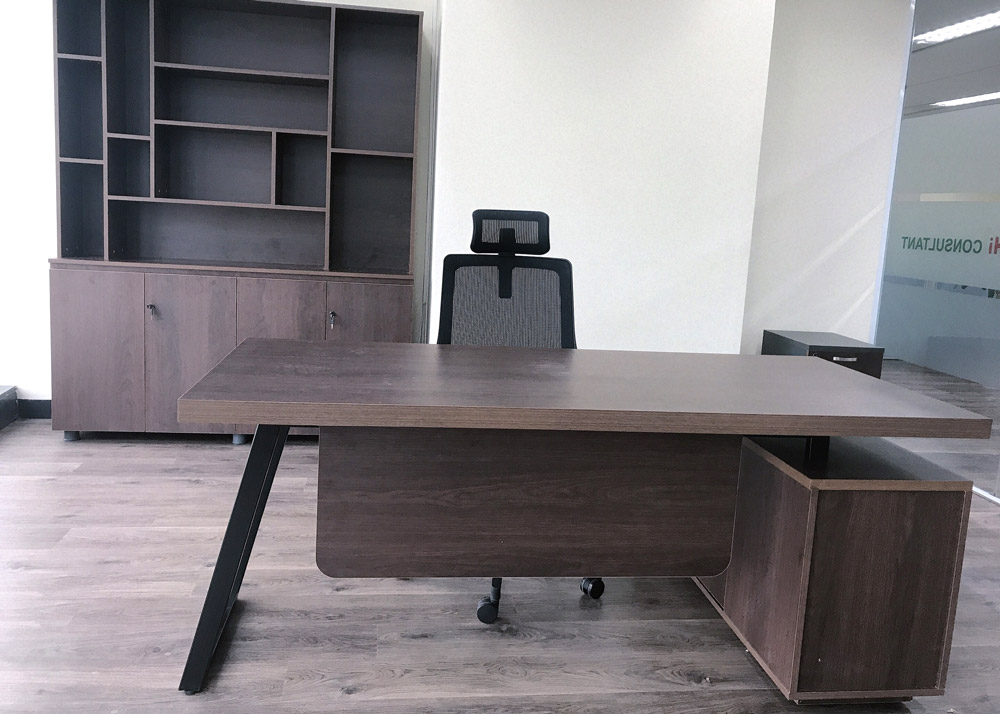 Bàn làm việc lãnh đạo có thiết kế kích cỡ lớn cả về chiều dài và chiều rộng. Mặt bàn dày, chân sắt sơn đen tĩnh điện choãi ra phía ngoài tạo sự chắc chắn và có tính chịu lực cao. Phía trước bàn có yếm gỗ bo tròn các góc rất tinh tế.