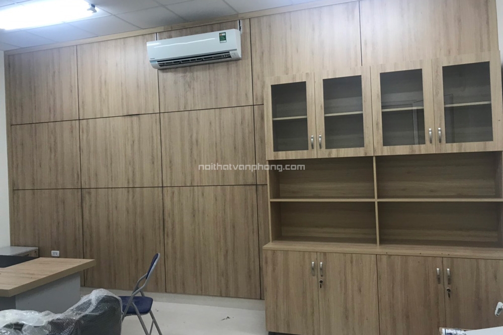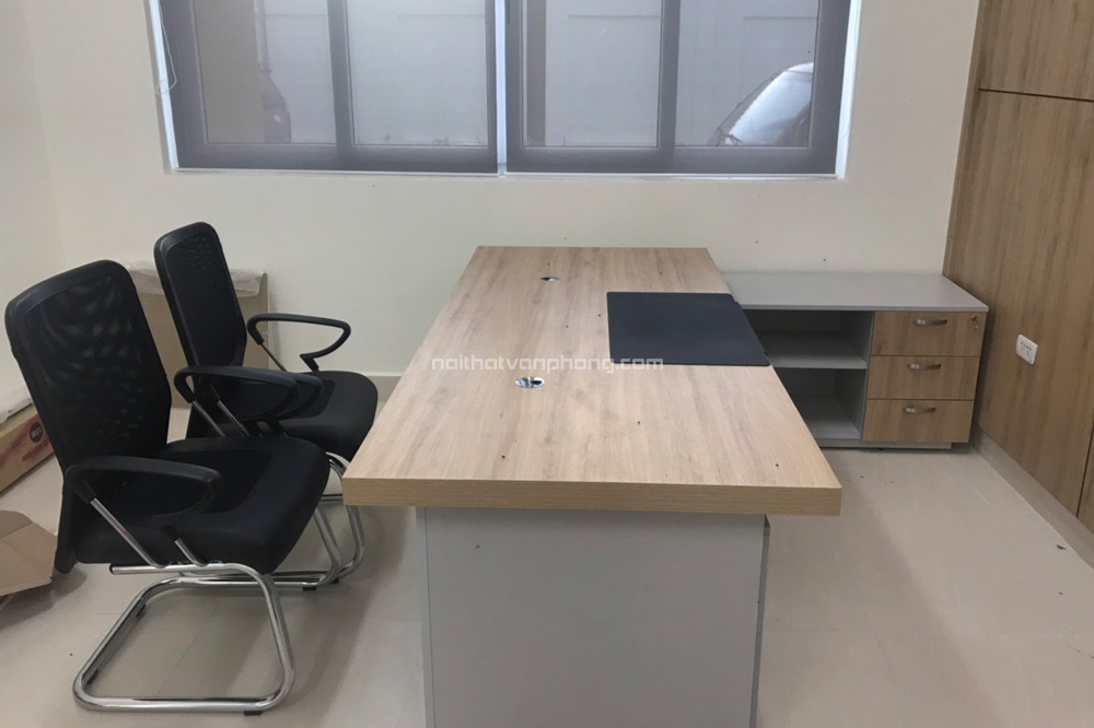 Thiết kế của phòng lãnh đạo hướng đến sự tinh tế, thanh lịch, đầy đủ các tiện ích kèm theo. Các đồ dùng nội thất được lựa chọn trong căn phòng đều theo phong cách đơn giản, tính thẩm mỹ cao. Điểm nhấn là tone màu trầm cùng các đường vân gỗ trên chất liệu gỗ công nghiệp melamine của bàn làm việc.