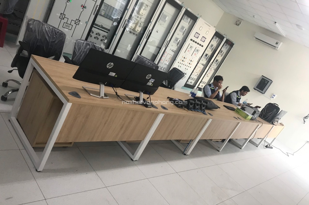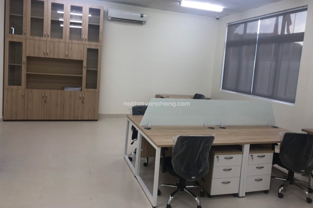 Phòng làm việc này có kích thước nhỏ hơn so với phòng số 1 đã tìm hiểu ở trên. Không gian này bố trí cụm module bàn làm việc gỗ công nghiệp MFC và một mẫu bàn chữ L dành riêng cho trưởng phòng. Hệ thống đèn âm trần được lắp đặt ở văn phòng đảm bảo điều kiện làm việc đầy đủ ánh sáng nhất.