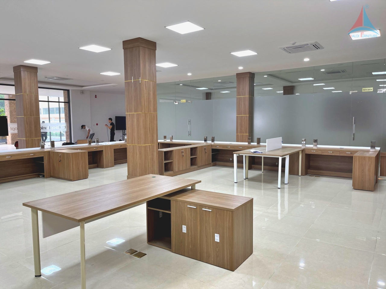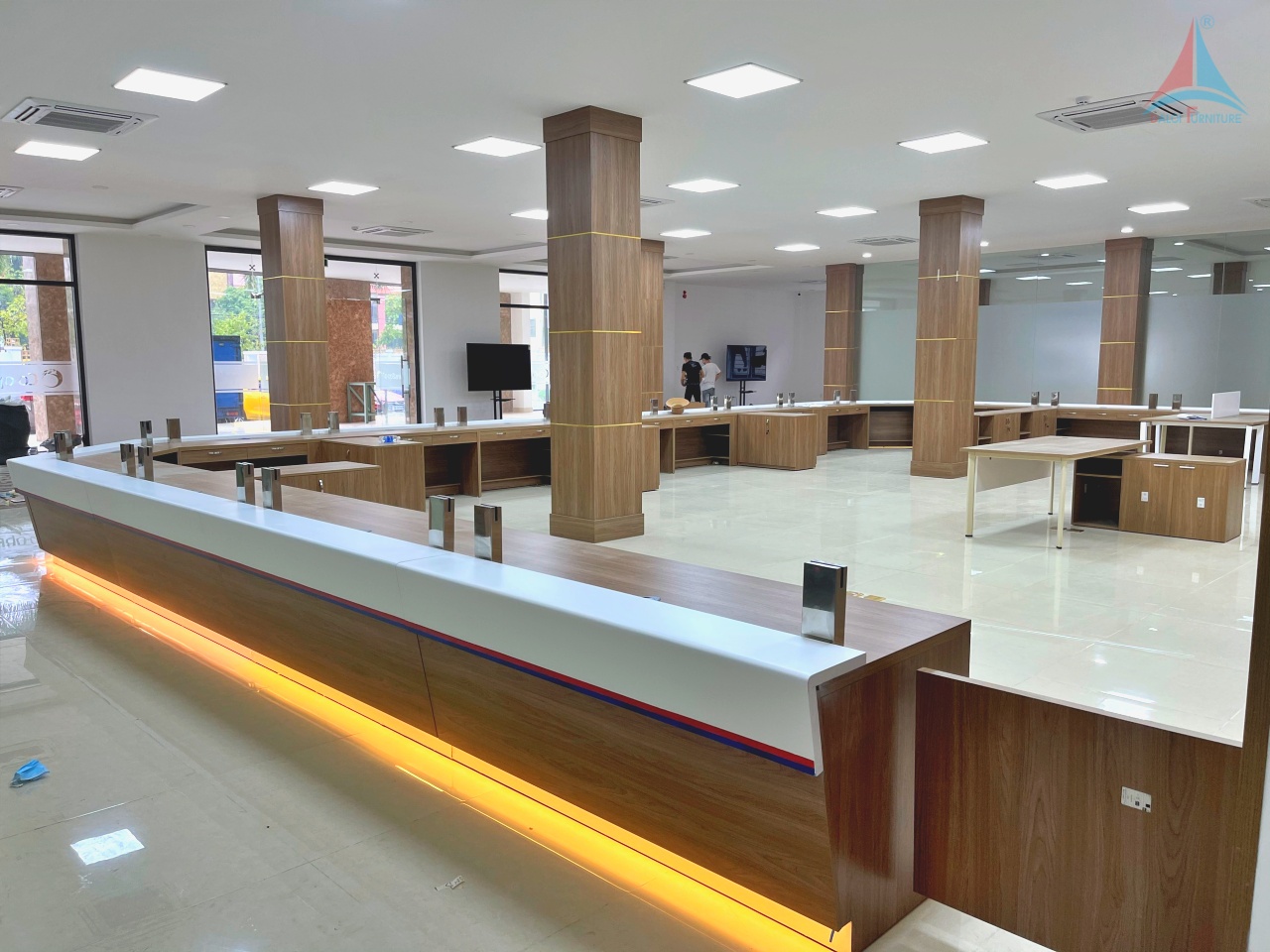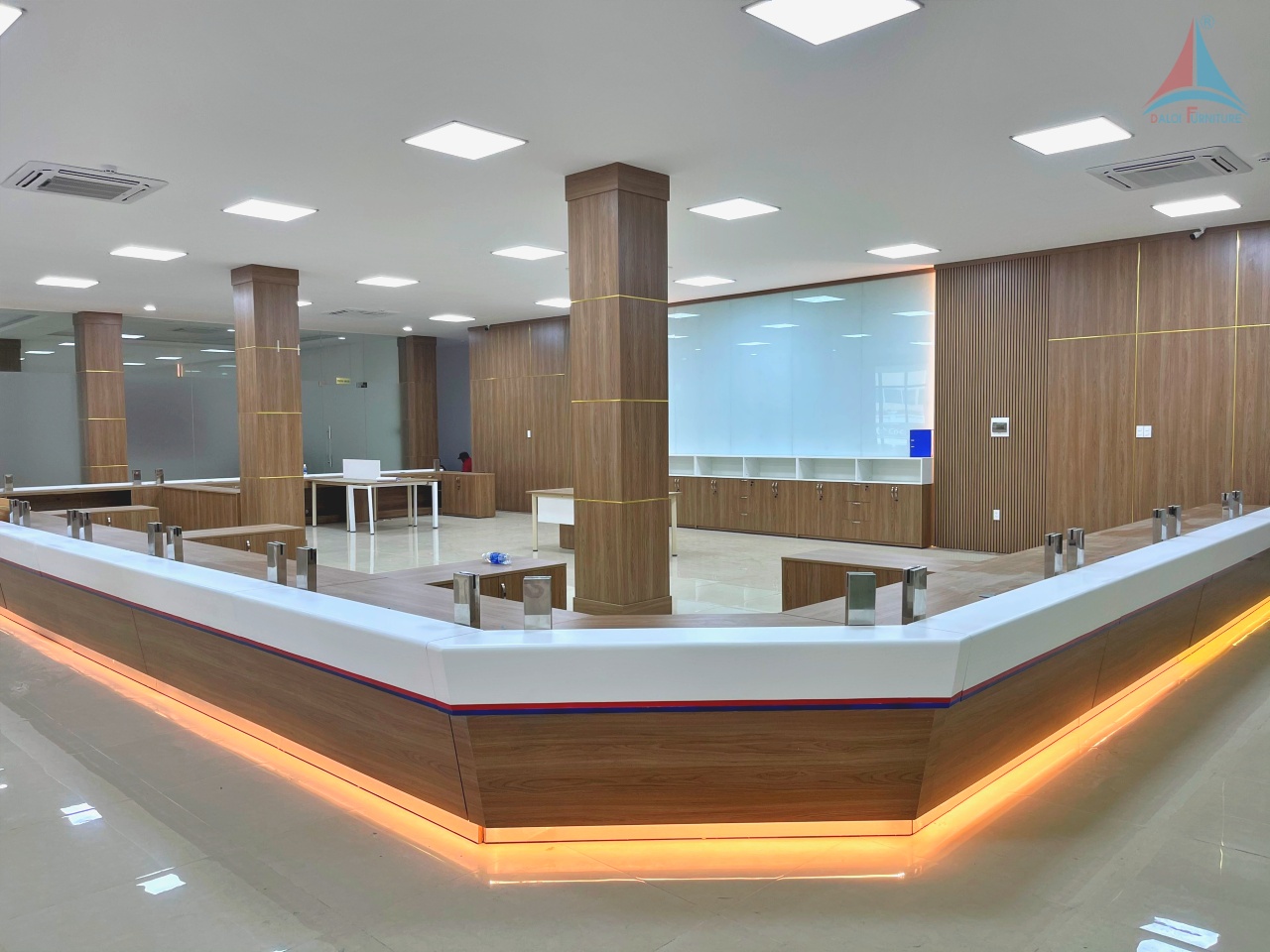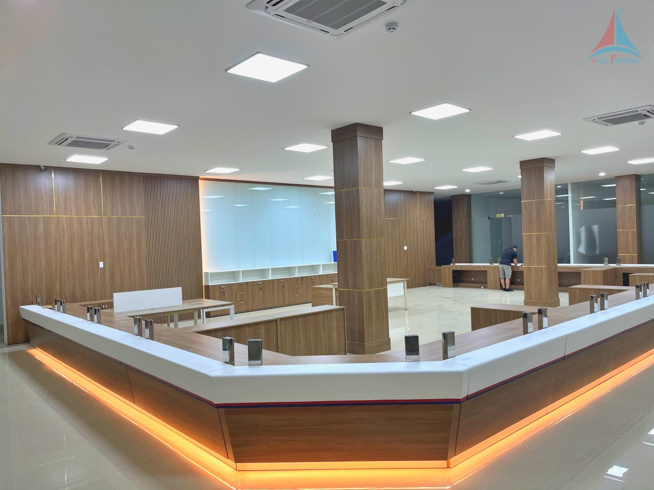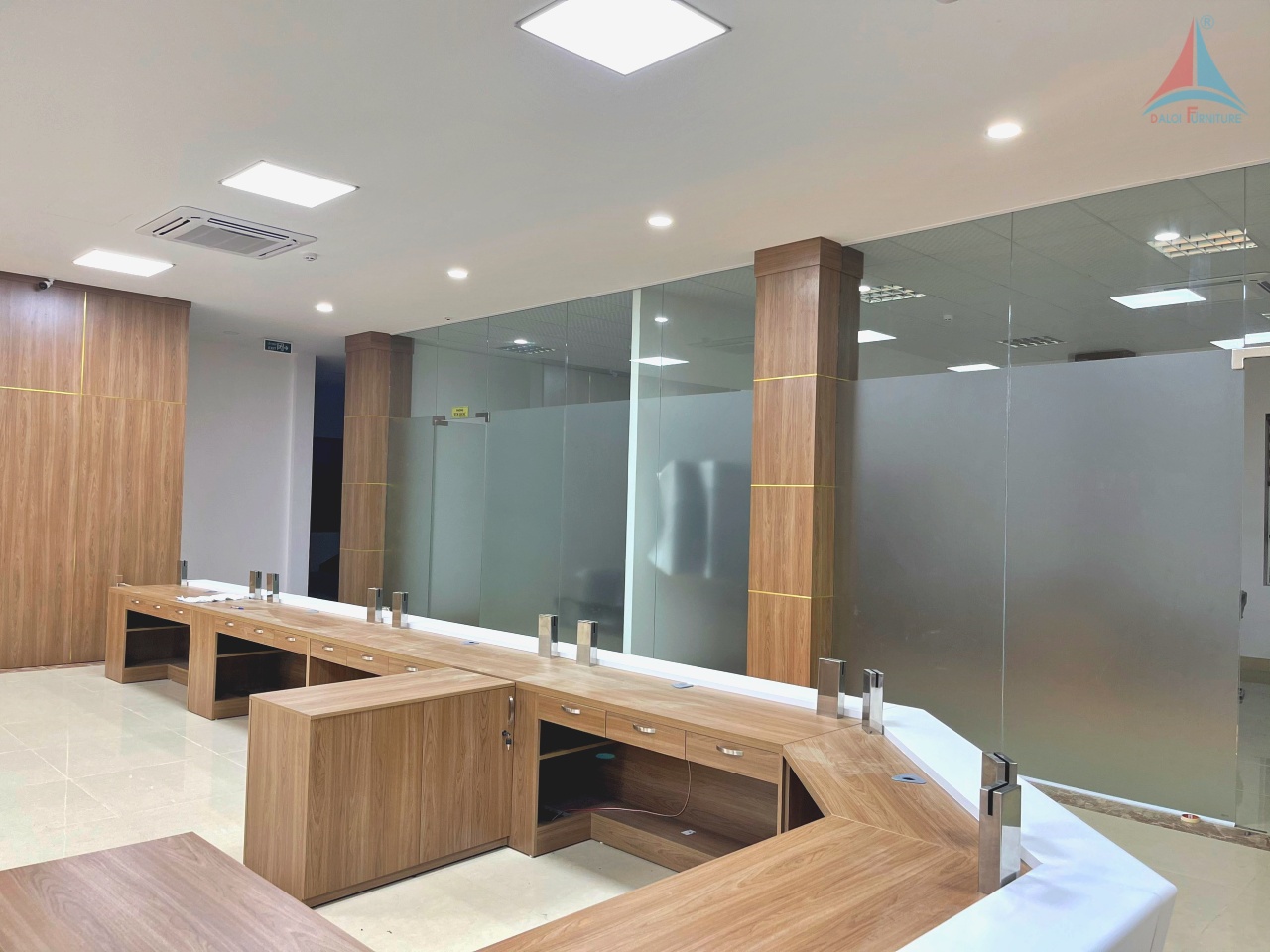 Bàn quầy giao dịch được xếp theo dạng chữ U nên rất tiện lợi cho khách đến giao dịch. Bàn được gia công từ chất liệu gỗ công nghiệp. Các ô giao dịch được gắn thêm vách ngăn kính để phân tách với không gian bên ngoài quầy giao dịch mang tới sự riêng tư, an toàn cho nhân viên trong suốt quá trình làm việc.