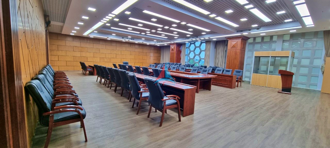 Bục hội trường gỗ với 2 màu sắc nâu và đen hài hòa tổng thể không gian phòng họp. Chiều cao của bục được lựa chọn rất cẩn thận sao cho phù hợp với đa số tầm vóc của người Việt. Với cửa sổ, thiết kế thêm phần khung cách điệu vừa có mục đích trang trí thêm cho căn phòng và mở rộng để đón ánh sáng tự nhiên đem đến một không gian mở, rộng rãi.