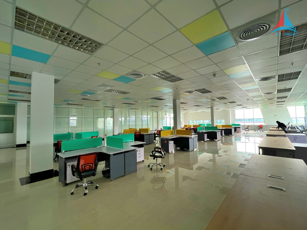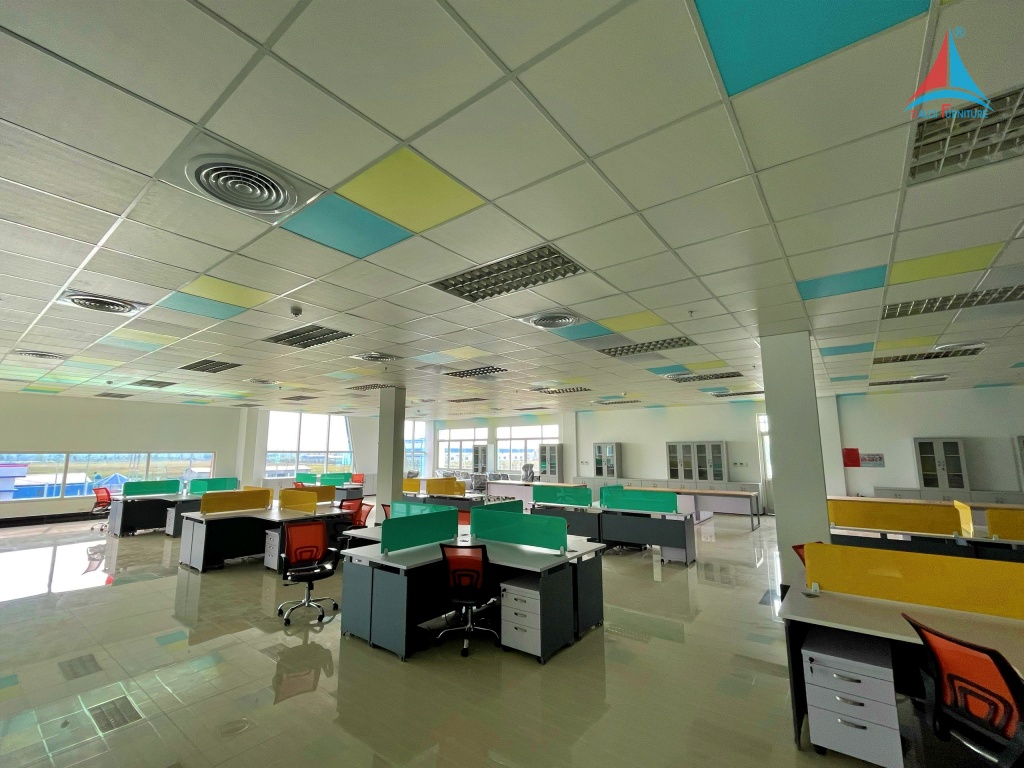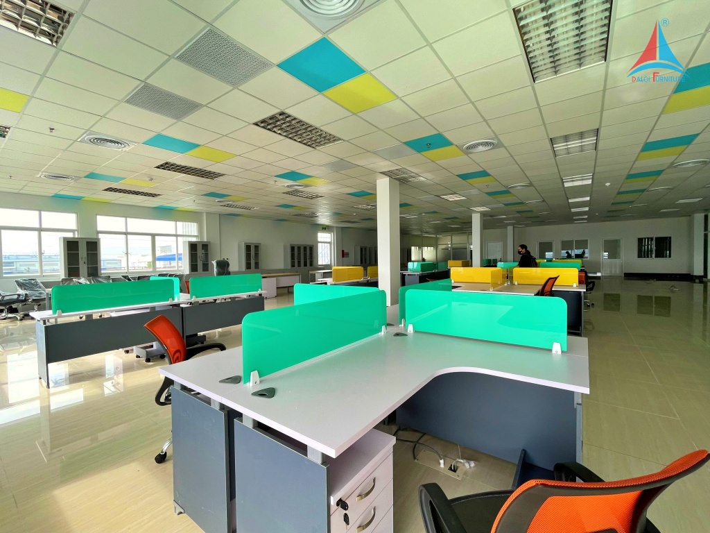 Phòng làm việc chung gồm ba dãy bàn làm việc được xếp theo chiều dài của không gian. Đội ngũ kiến trúc sư của Nội Thất Đa Lợi đã lựa chọn thiết kế không gian mở với các mẫu module bàn văn phòng có vách ngăn kính cường lực chắc chắn cho phép các nhân viên dễ dàng tương tác với nhau khi làm việc.