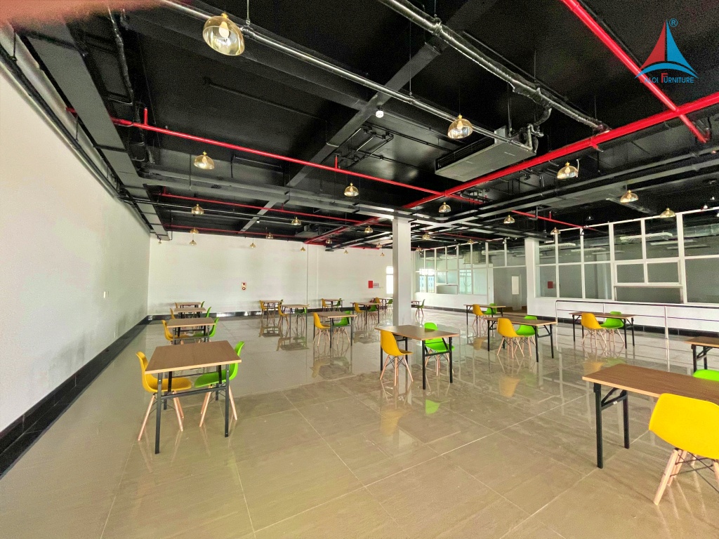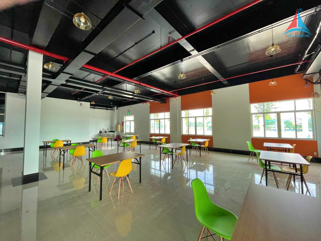 Có 4 dãy bàn được bố trí dọc theo chiều dài của phòng ăn. Khoảng cách giữa các bộ bàn ghế luôn được tuân thủ để đảm bảo việc di chuyển ở khoảng giữa dãy bàn thoải mái, không khó chịu. Bàn mặt gỗ chân sắt kết hợp với ghế chân tĩnh có màu sắc nổi bật.
