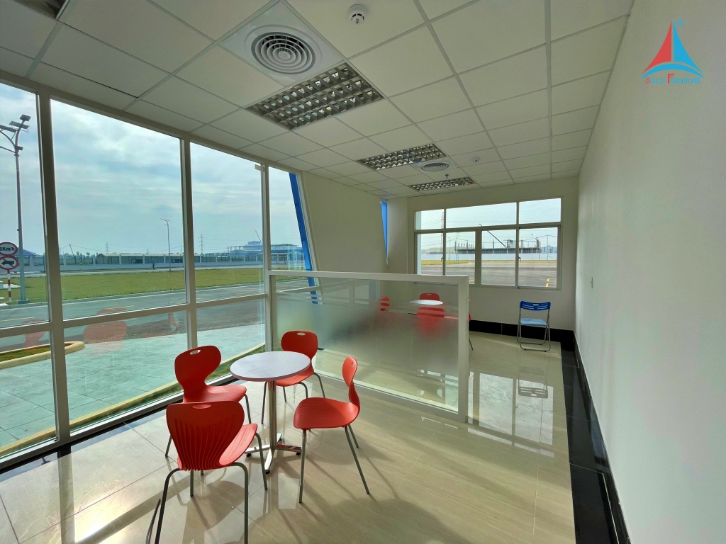 Không gian phòng sinh hoạt chung được chia thành 2 khu vực riêng biệt với vách ngăn kính mờ. Tầm nhìn hướng về khoảng xanh sân vườn trong khuôn viên công ty tạo cảm giác căn phòng rộng rãi hơn. Bàn thiết kế dạng tròn, nhỏ gọn kết hợp với ghế chân tĩnh có màu sắc tươi sáng, sặc sỡ làm điểm nhấn nổi bật cho tổng thể không gian.