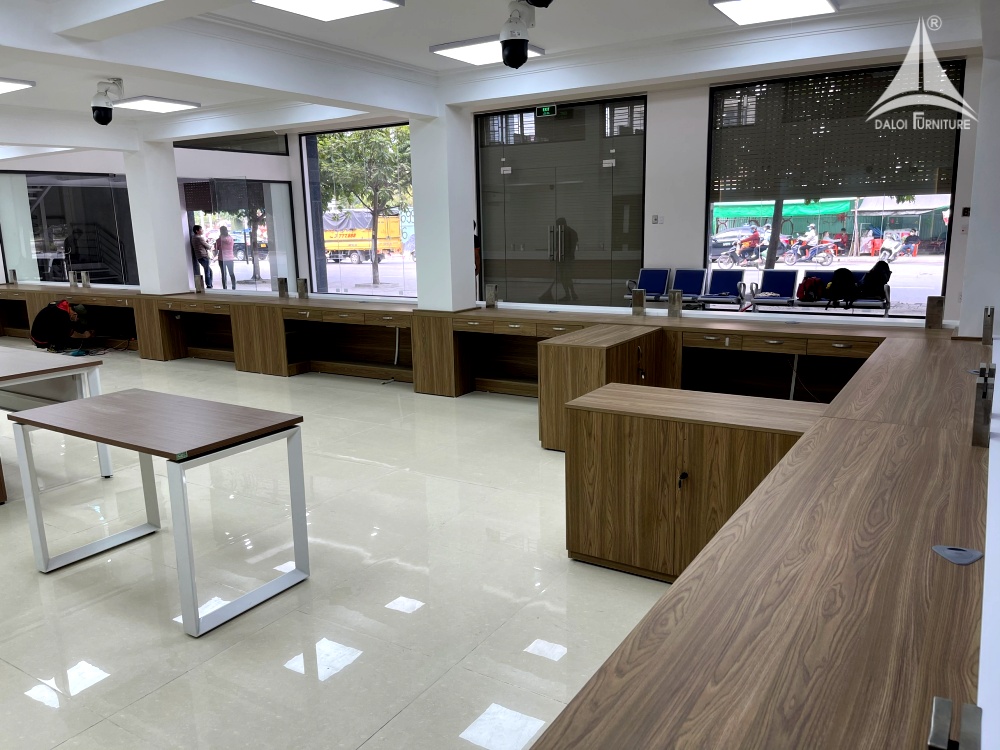 Khu vực giao dịch và làm việc là sự kết hợp hài hòa của bàn làm việc và hệ thống tủ tài liệu, hộc tủ di động. Chất liệu chính là veneer sồi sơn phủ PU và gỗ MFC cao cấp. Từ đó, tạo nên không gian làm việc trang nhã, đáp ứng yêu cầu lưu trữ tài liệu lớn cho ngân hàng Co-Opbank Hải Phòng.