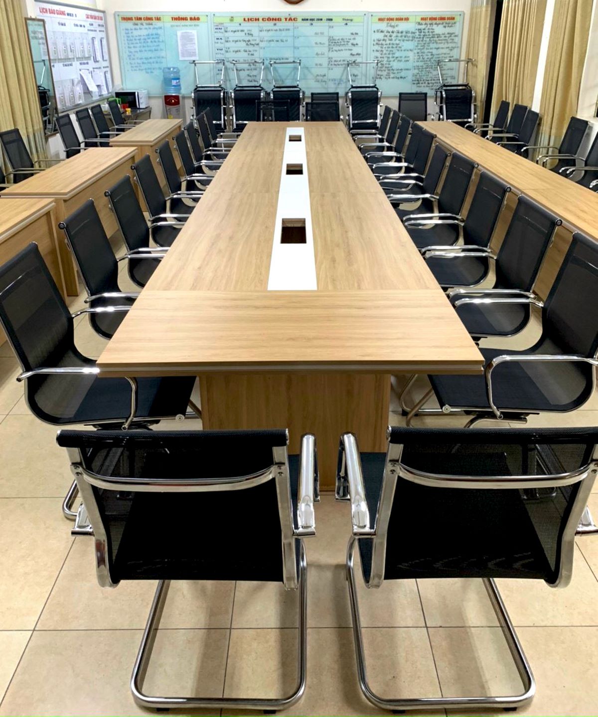 Có thể nói không gian phòng hội đồng của trường khá rộng rãi với sức chứa lên đến khoảng 40 – 45 người mà không hề tạo cảm giác khó chịu, chật chội. Theo đó, với kiểu thiết kế bàn và ghế đã được Nội Thất Đa Lợi lựa chọn không gian phòng hội đồng sẽ thêm trang trọng hơn đúng tính chất sử dụng của căn phòng.