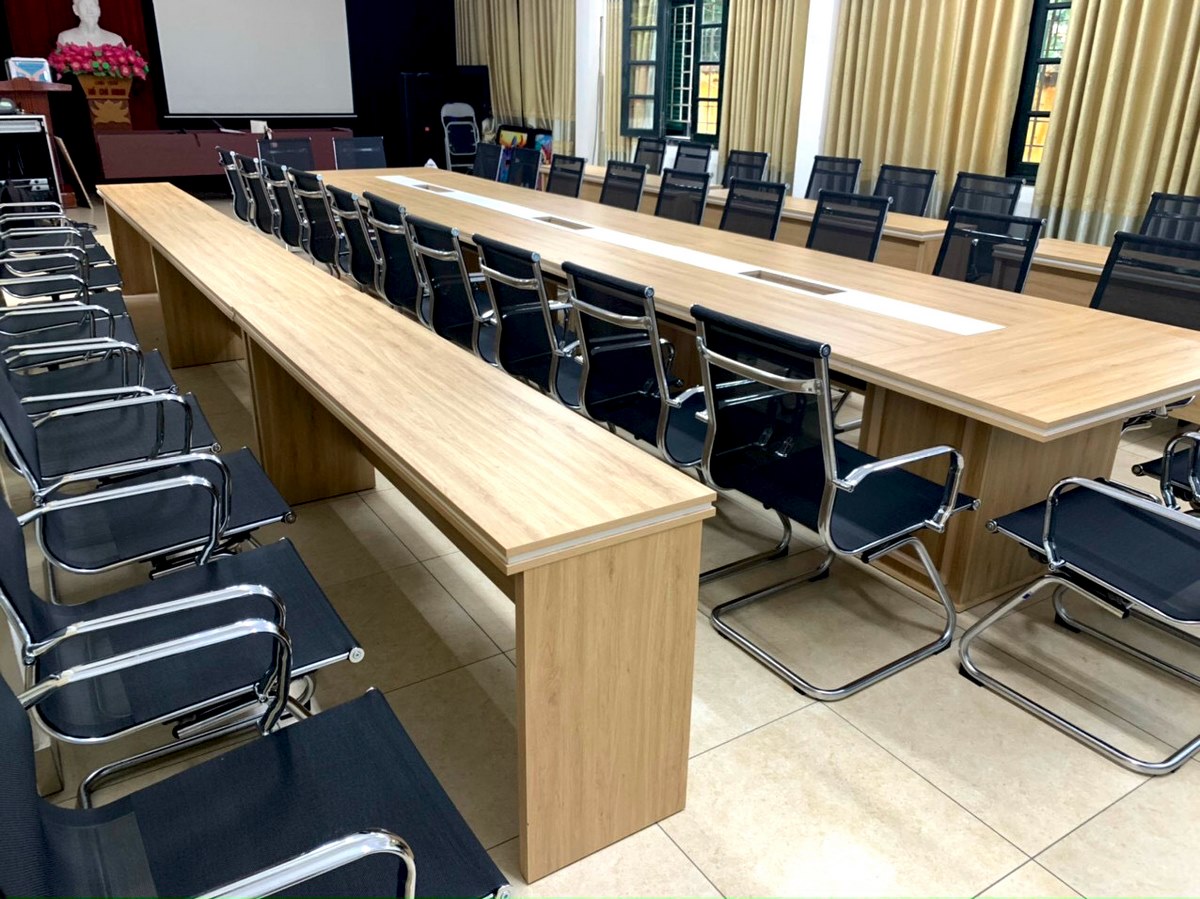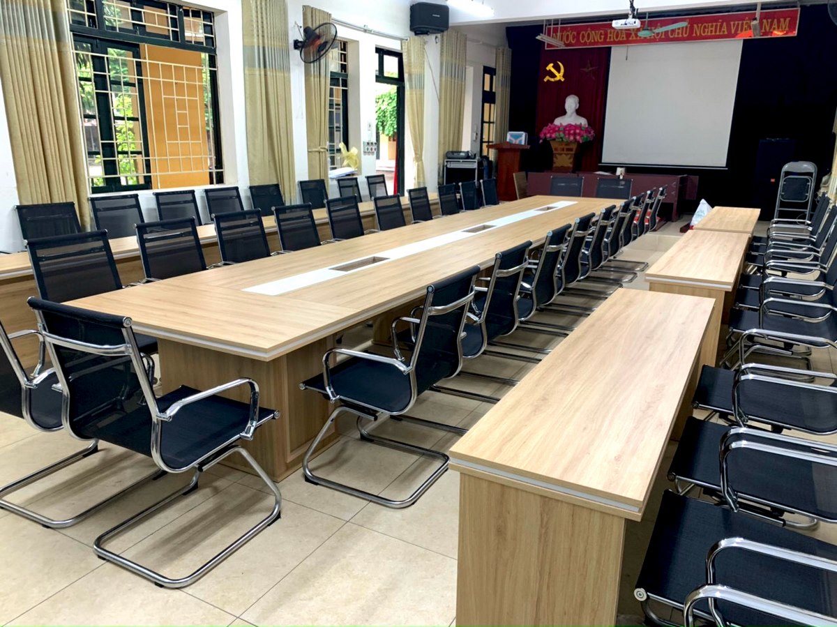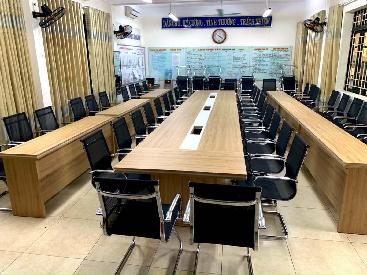 Phòng hội đồng trường THCS Quang Trung – Hà Nội bố trí mẫu bàn có kiểu dáng truyền thống. Phòng trang bị mẫu bàn chữ nhật dài với kích thước lớn được bố trí xung quanh là dãy ghế lưới chân quỳ. Với kiểu bàn kích thước lớn như này có thể cho phép 20 người ngồi xung quanh. 2 bên còn có 2 dãy bàn lẻ được ghép từ những chiếc bàn đơn lại với nhau.