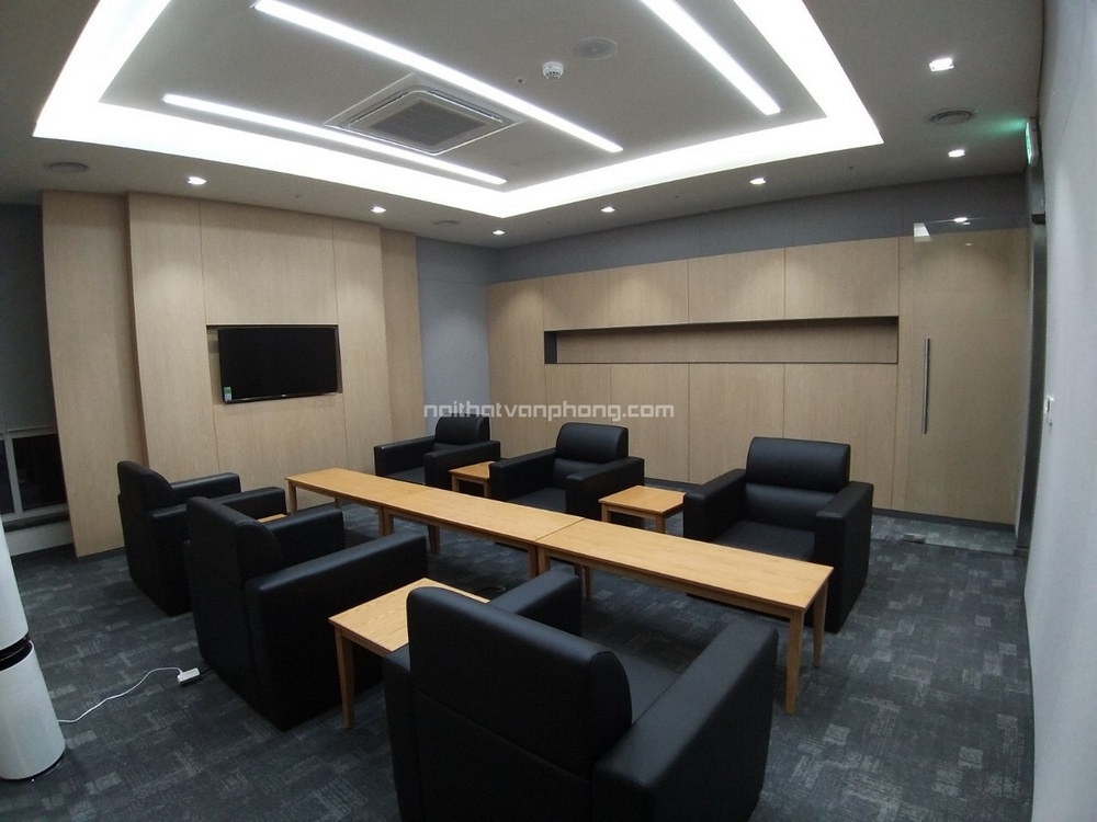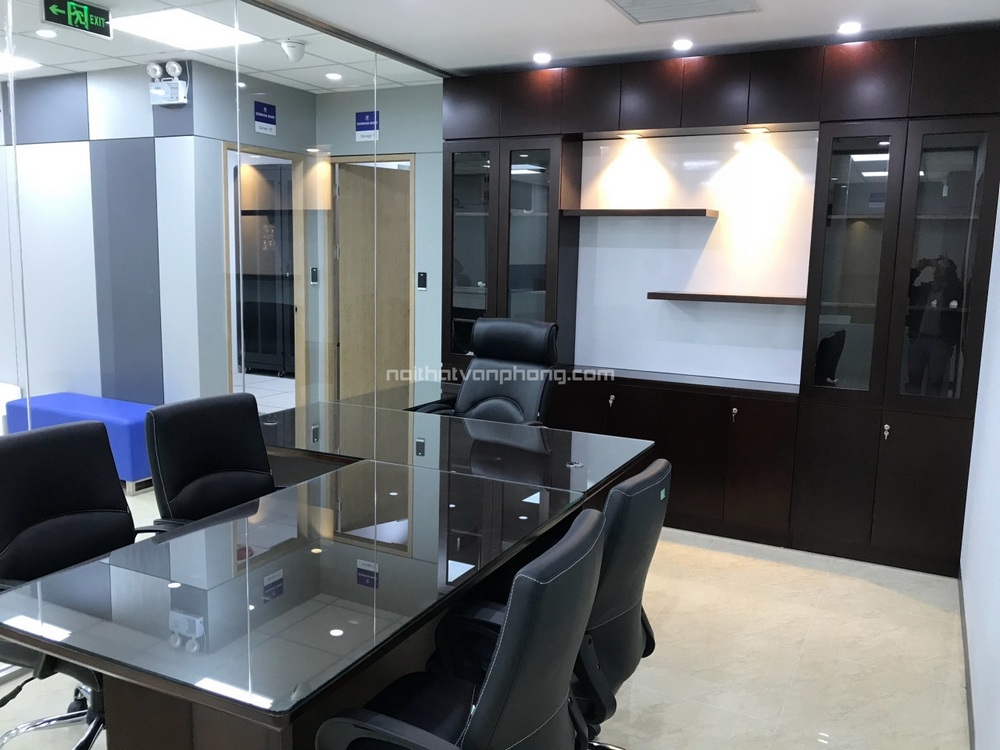 Văn phòng lãnh đạo của chi nhánh ngân hàng Shinhan Bank có thiết kế theo hướng hiện đại. Chiếc bàn gỗ màu trầm cao cấp mặt kính kết hợp cùng ghế da xoay lưng tựa cho không gian thêm chuyên nghiệp, tinh tế. Bàn có thiết kế dạng chữ L bố trí bên cạnh dãy bàn chữ nhật tạo nên không gian phòng họp nhỏ ngay trong phòng giám đốc. Chất liệu gỗ công nghiệp là lựa chọn phù hợp nhất, thể hiện rõ đẳng cấp và khẳng định quyền lực người đứng đầu.