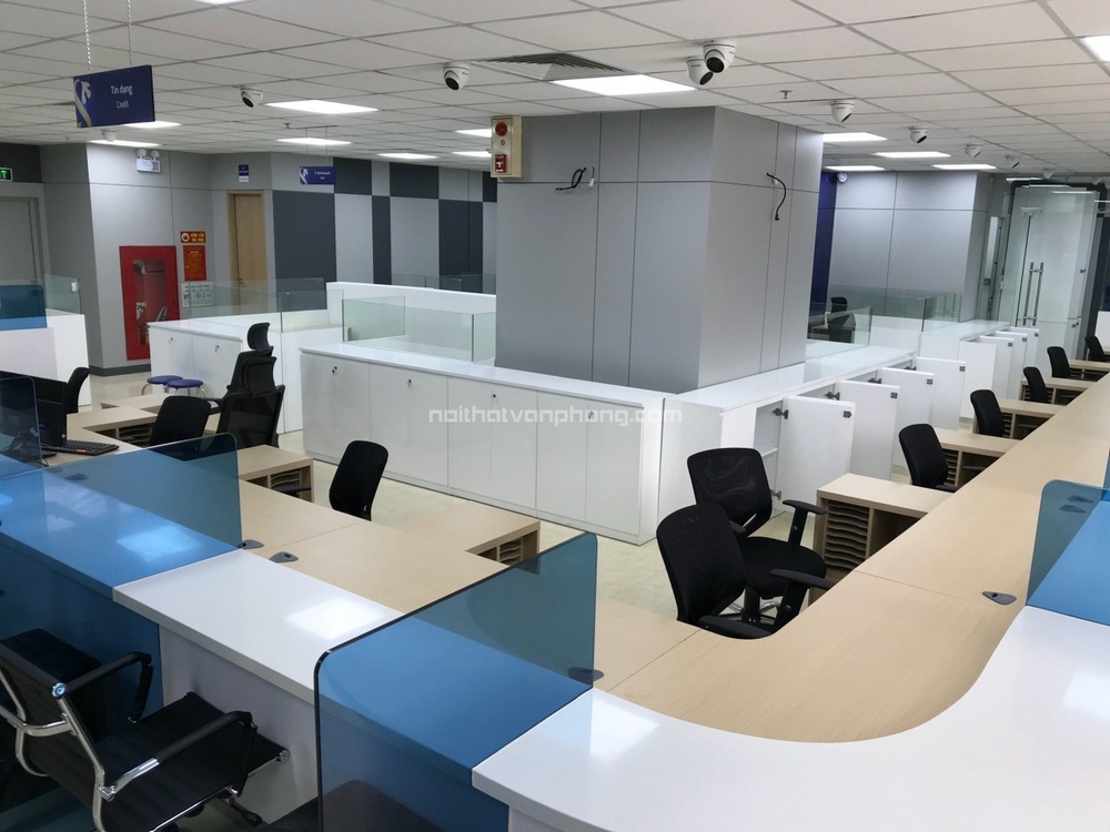 Bàn có thiết kế hiện đại kèm theo tủ phụ thông minh tăng thêm không gian lưu trữ tài liệu, đồ dùng cá nhân. Ngoài ra, quầy giao dịch còn bố trí thêm một dãy tủ tài liệu có cùng tông màu đáp ứng yêu cầu cất giữ hồ sơ có tính bảo mật cao của chi nhánh ngân hàng Shinhan Bank.