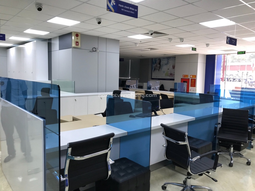 Bàn quầy giao dịch có độ bền cao, mặt gỗ màu trắng sáng tạo ấn tượng cho khách hàng, đối tác đến chi nhánh ngân hàng Shinhan Bank với chất liệu gỗ MDF phủ Melamine có khả năng chống mối mọt, cong vênh, vệ sinh đơn giản. Khung bàn chắc chắn được gắn vách ngăn trực tiếp vào mặt bàn tạo nên không gian riêng tư cho mỗi khu quầy giao dịch.