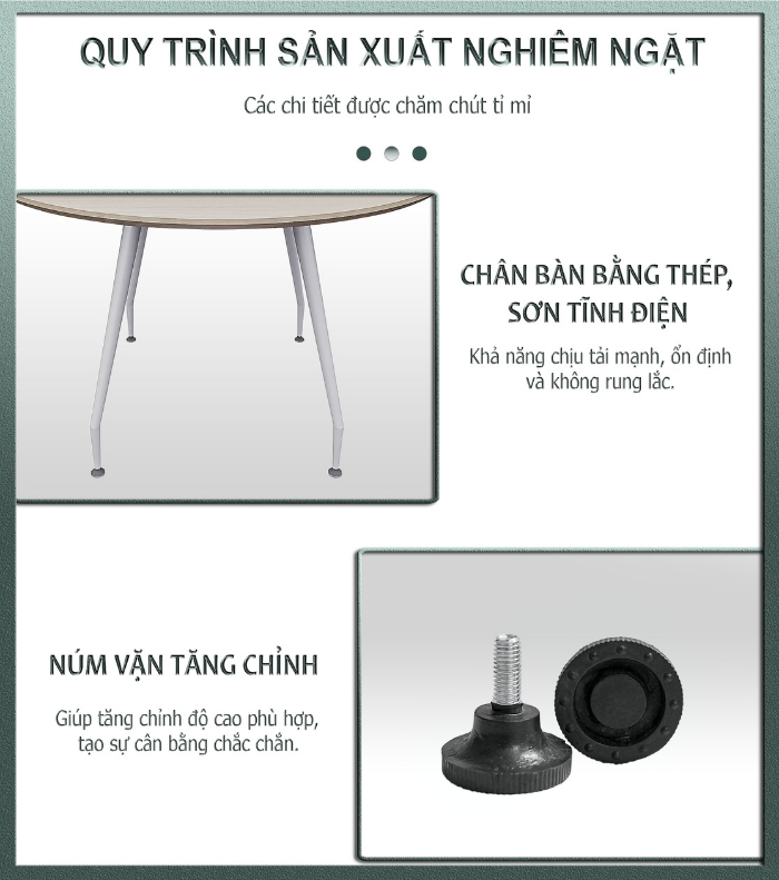 - Khung bàn thép cao cấp, sơn tĩnh điện chống gỉ sét, bền đẹp theo thời gian.