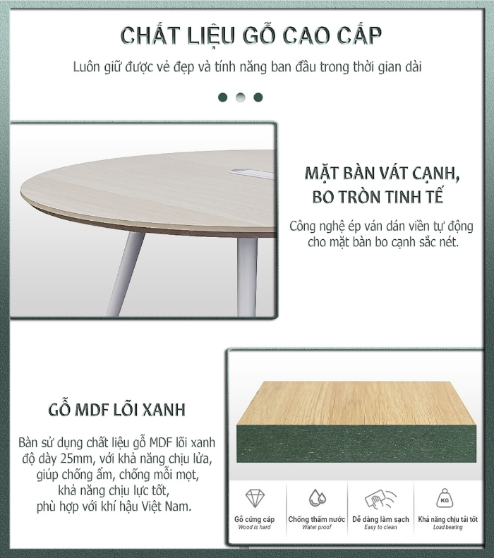 - Mặt bàn gỗ công nghiệp lõi xanh phủ Melamine chống cháy, chống xước, chống thấm nhẹ.