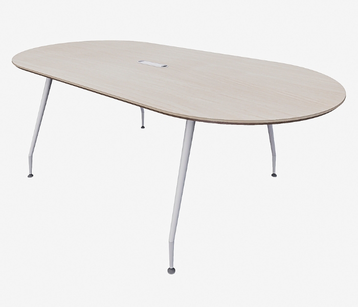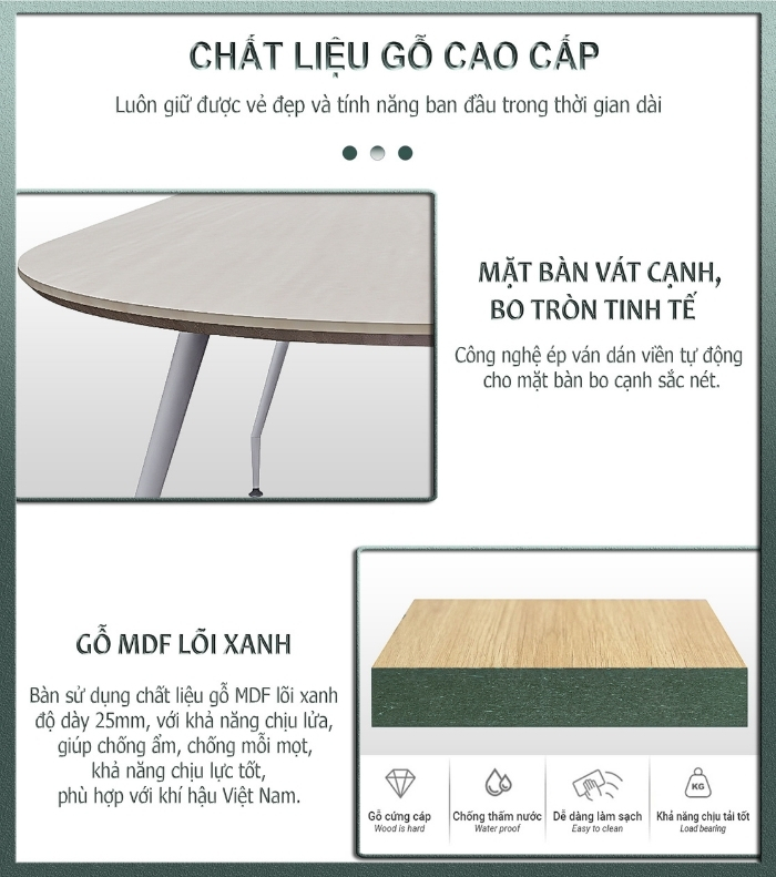 • Mặt bàn họp hình bầu dục gỗ công nghiệp lõi xanh phủ Melamine chống cháy, chống xước, chống thấm nhẹ, cạnh vát tinh tế, dán viền tự động sắc nét.
