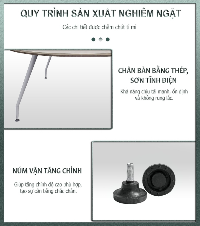 • Chân bàn thép sơn tĩnh điện, có núm vặn tăng chỉnh linh hoạt. Kiểu dáng tối giản, hiện đại, dễ dàng phù hợp với nhiều không gian văn phòng.