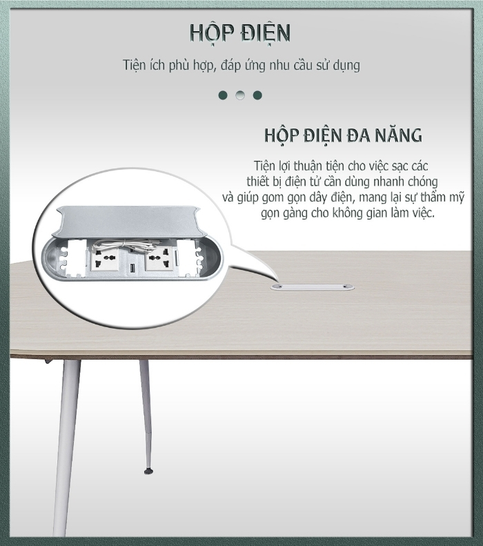 • Bên trên mặt bàn có trang bị hộp điện kĩ thuật, đảm bảo tiện ích cho người dùng trong việc sử dụng laptop, máy chiếu.