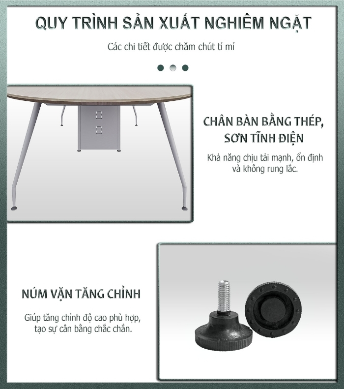 - Khung bàn phòng họp bằng thép cao cấp sơn tĩnh điện, bền bỉ, chống gỉ sét.