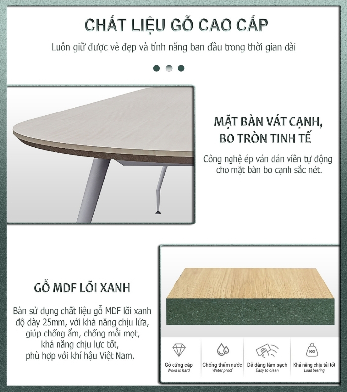 - Mặt bàn gỗ công nghiệp lõi xanh phủ Melamine chống cháy, chống trầy xước, chống nước nhẹ.