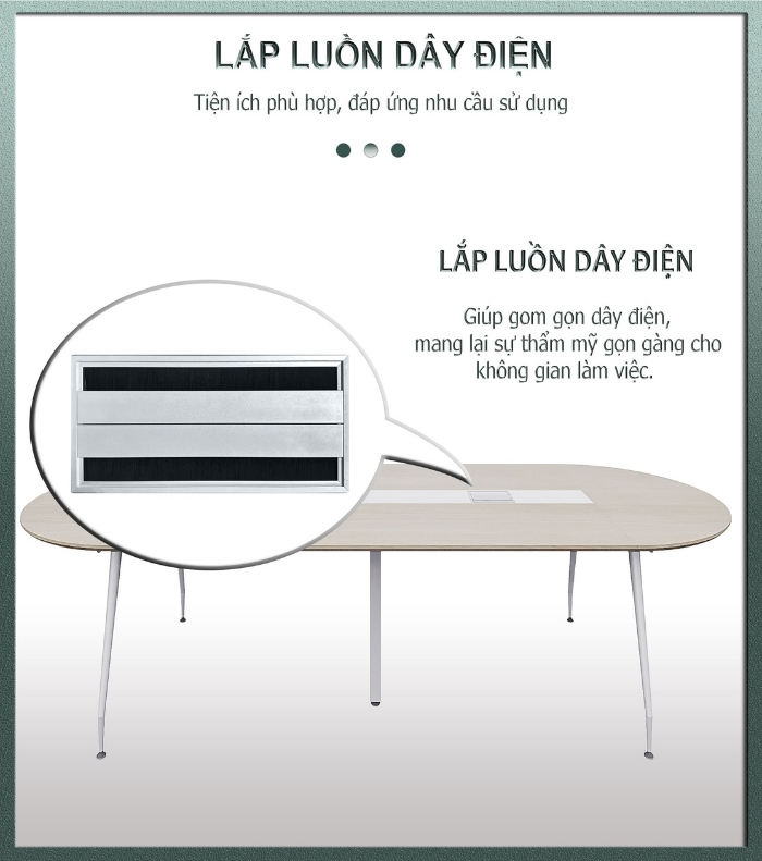 - Tích hợp hộp điện kỹ thuật trên mặt bàn, tiện lợi khi sử dụng laptop, máy chiếu và các thiết bị văn phòng.