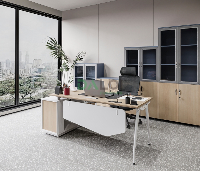 - Thiết Kế Bàn Chữ L Rộng Rãi: Thiết kế bàn chữ L hiện đại mang đến không gian làm việc rộng rãi, giúp người quản lý dễ dàng thao tác và sắp xếp tài liệu.