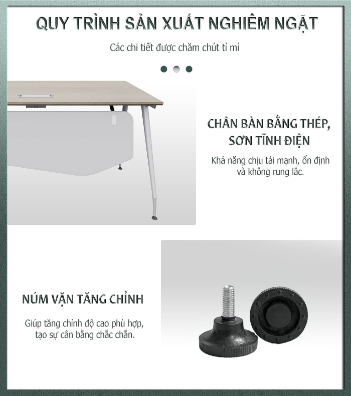 - Chân Tăng Chỉnh: Chân bàn thép sơn tĩnh điện có núm vặn tăng chỉnh, giúp bàn trưởng phòng cân bằng chắc chắn trên mọi mặt sàn, kể cả mặt sàn không bằng phẳng.