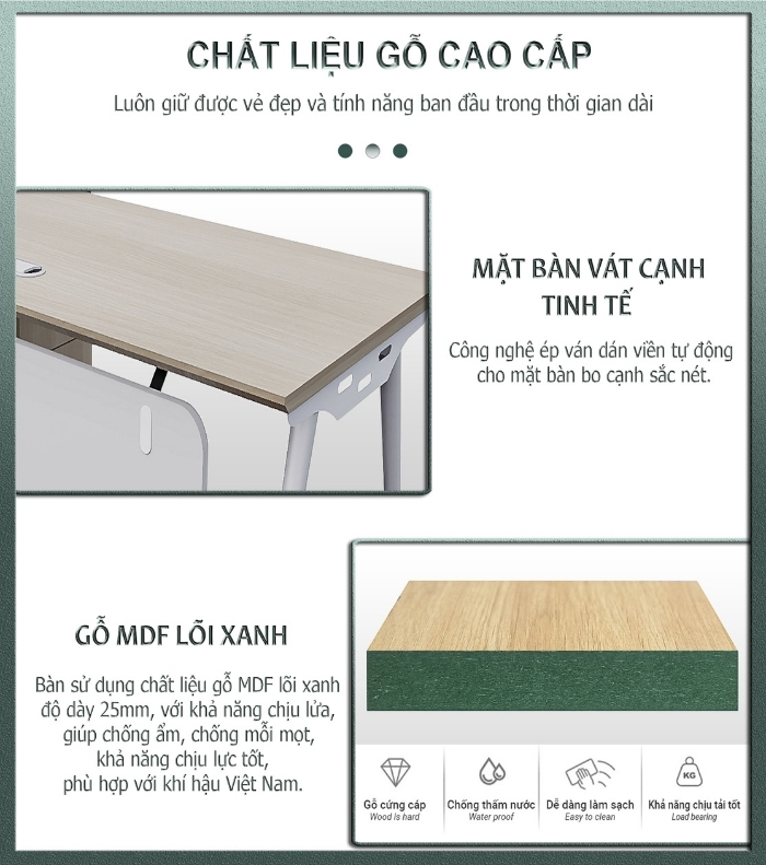 | Chất Liệu | Khung bàn thép cao cấp, phủ sơn tĩnh điện chống gỉ. Mặt bàn gỗ công nghiệp lõi xanh phủ Melamine chống cháy, chống trầy, chống thấm nhẹ. |