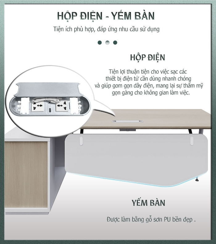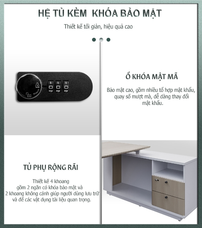 - Hộc Tủ Tích Hợp Khóa Mật Mã: Hộc tủ tiện ích gồm 2 ngăn kéo và các ngăn mở, đặc biệt tích hợp khóa mật mã an toàn để bảo mật tài liệu quan trọng tuyệt đối.