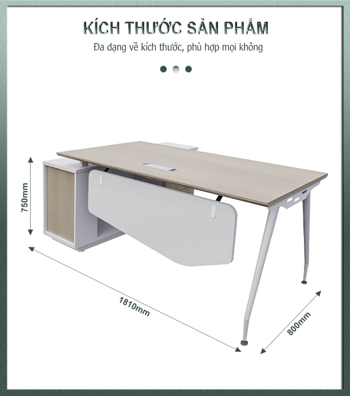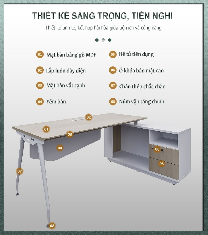 - Linh Hoạt Ứng Dụng: Ngoài làm bàn trưởng phòng, sản phẩm cũng có thể được sử dụng làm bàn nhân viên cấp cao hoặc bàn làm việc tại nhà, nhờ vào thiết kế đa năng và tiện ích lưu trữ.