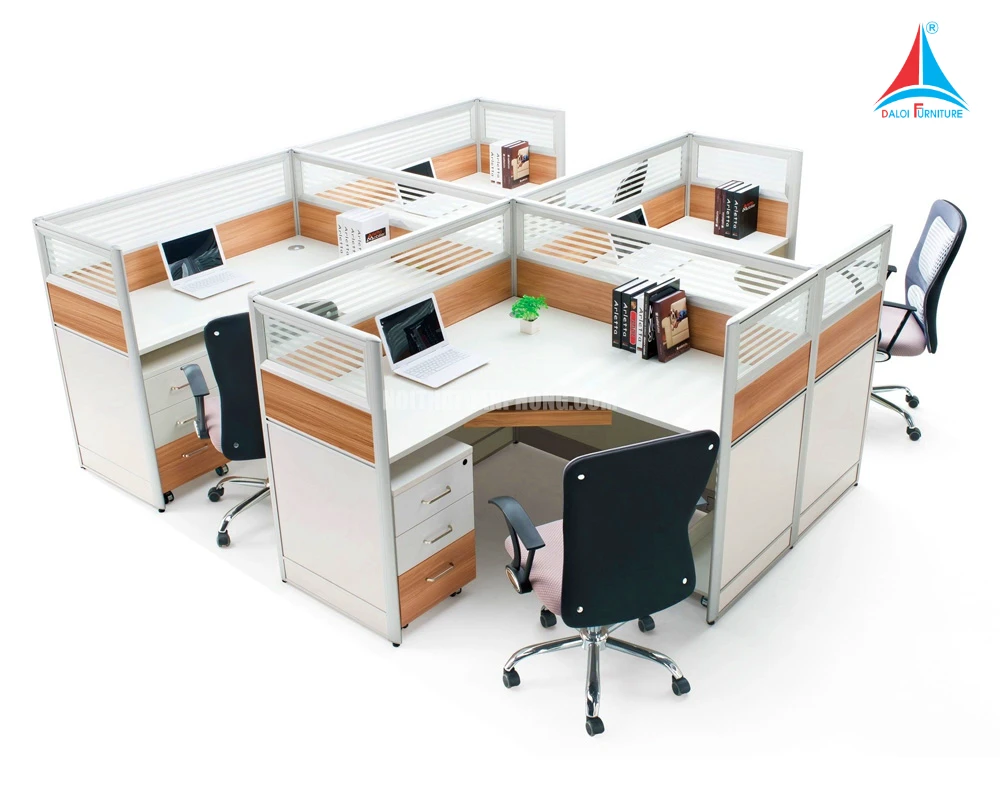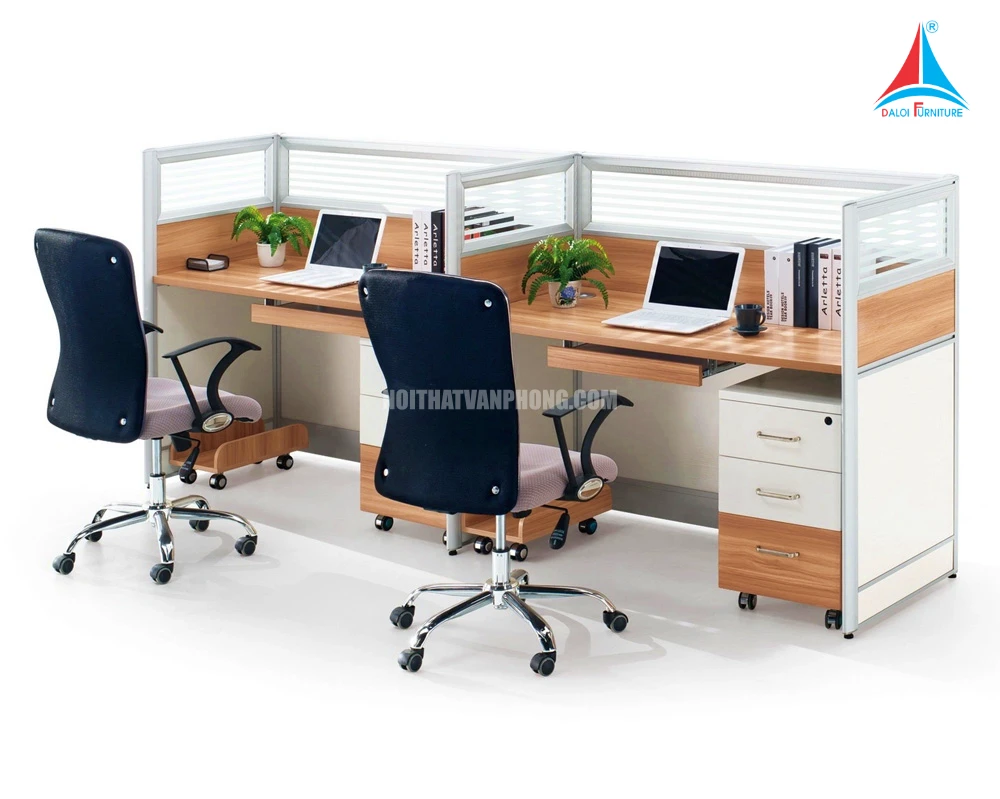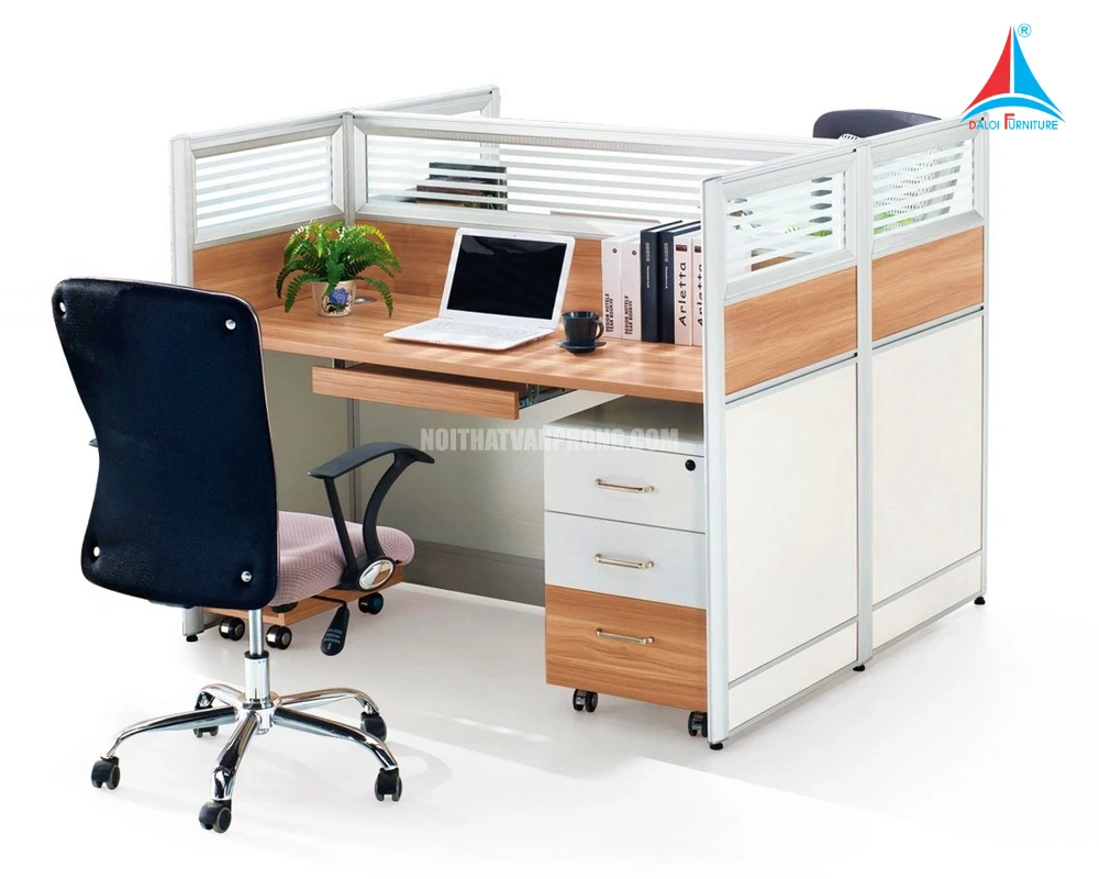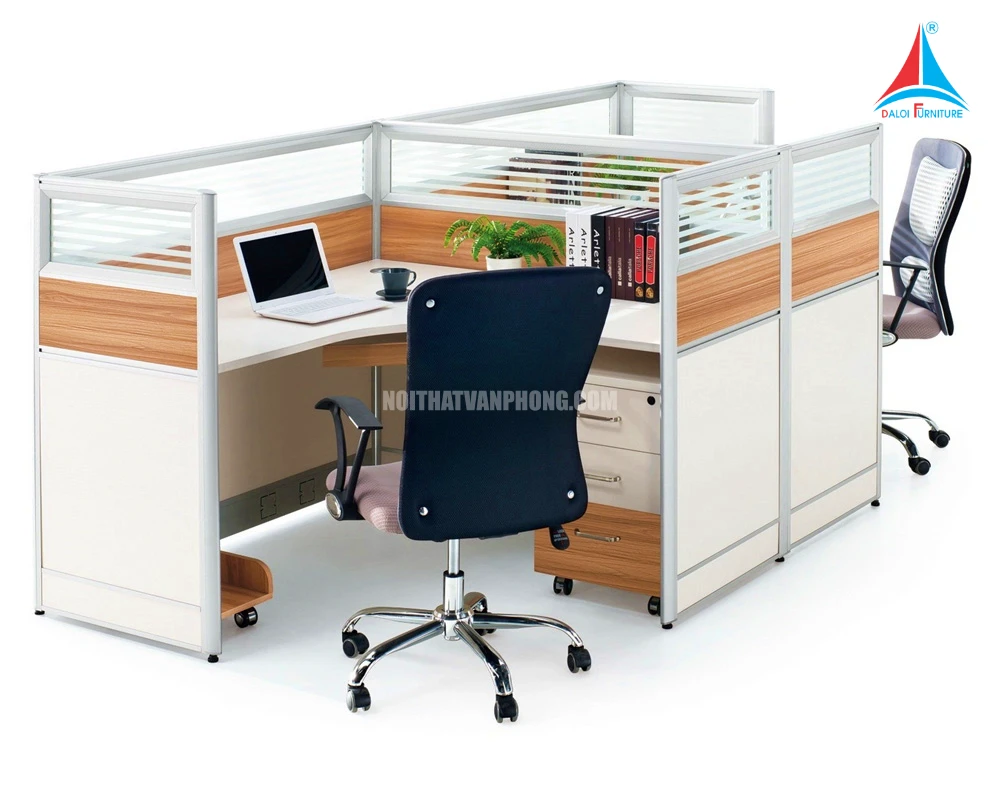 - Kiểu dáng: Bàn thiết kế dạng cụm 4 người ngồi, có vách ngăn và hộc tủ tài liệu tiện lợi.