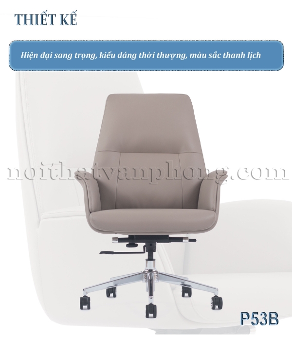 • Thiết Kế Tinh Tế và Gọn Gàng: Là mẫu ghế xoay da lưng trung, P53B tạo sự thoáng đãng cho không gian, đồng thời tay ghế liền mạch bọc da mềm mang lại vẻ ngoài hiện đại và cảm giác êm ái khi sử dụng.