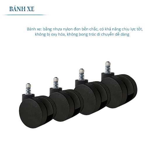- Bánh Xe Bọc Nhựa Nylon Chống Trầy Xước: 5 bánh xe nhựa Nylon giúp chiếc ghế lưới văn phòng này di chuyển êm ái, linh hoạt trên mọi mặt sàn mà không gây tiếng ồn hay làm trầy xước sàn nhà.