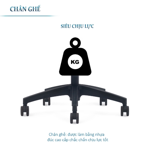 - Chân Ghế Chịu Lực Cao: Ghế sử dụng chân xoay 5 cánh bằng nhựa chịu lực (hoặc thép mạ tùy phiên bản), với kết cấu vững chắc, đảm bảo độ ổn định tuyệt đối và khả năng chịu tải cao.
