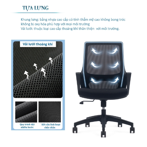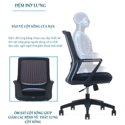 | Tựa lưng | – Tựa lưng bằng nhựa chịu lực đúc ép khuôn cao tần trên máy ép 1500 tấn, góc cạnh sắc nét không bị bavia và khả năng chịu uốn cao. Thiết kế liên kết cài lưới chống bung dạng kẹp khe. – Tựa lưng được thiết kế chuẩn công thái học phù hợp với khuôn lưng, chống vẹo cột sống, có bộ phận tỳ đỡ cột sống với khả năng điều chỉnh cao thấp theo sở thích của người sử dụng |