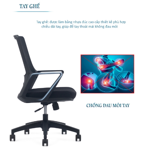 | Tay ghế | – Tay ghế được làm bằng nhựa chất lượng cao, hiện đại và thẩm mỹ cho không gian làm việc |