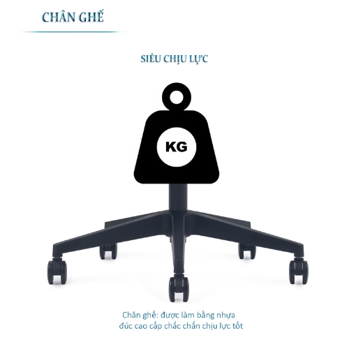 • Chân Ghế Chịu Lực Cao Cấp: Ghế sử dụng chân xoay 5 cánh bằng nhựa chịu lực cao cấp (như hình ảnh), với kết cấu vững chắc, đảm bảo độ ổn định tối ưu và khả năng chịu tải lớn.