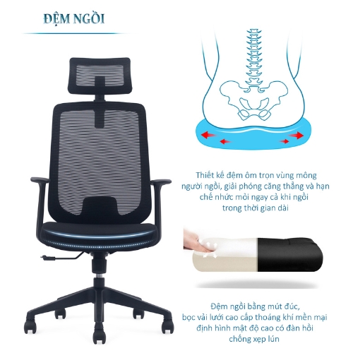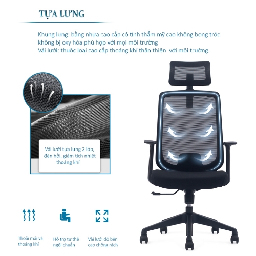 – Tựa lưng được thiết kế chuẩn công thái học phù hợp với khuôn lưng, chống vẹo cột sống, có bộ phận tỳ đỡ cột sống với khả năng điều chỉnh cao thấp theo sở thích của người sử dụng