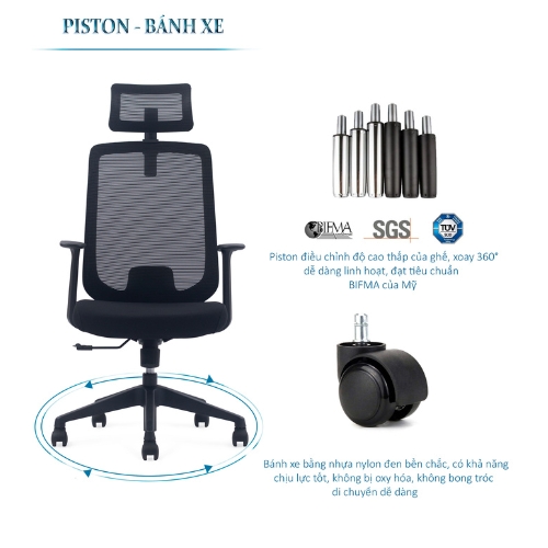 • Bánh Xe Nhựa Nylon Êm Ái: 5 bánh xe nhựa Nylon giúp chiếc ghế lưới văn phòng này di chuyển nhẹ nhàng, linh hoạt, không gây tiếng ồn và bảo vệ sàn nhà khỏi trầy xước.